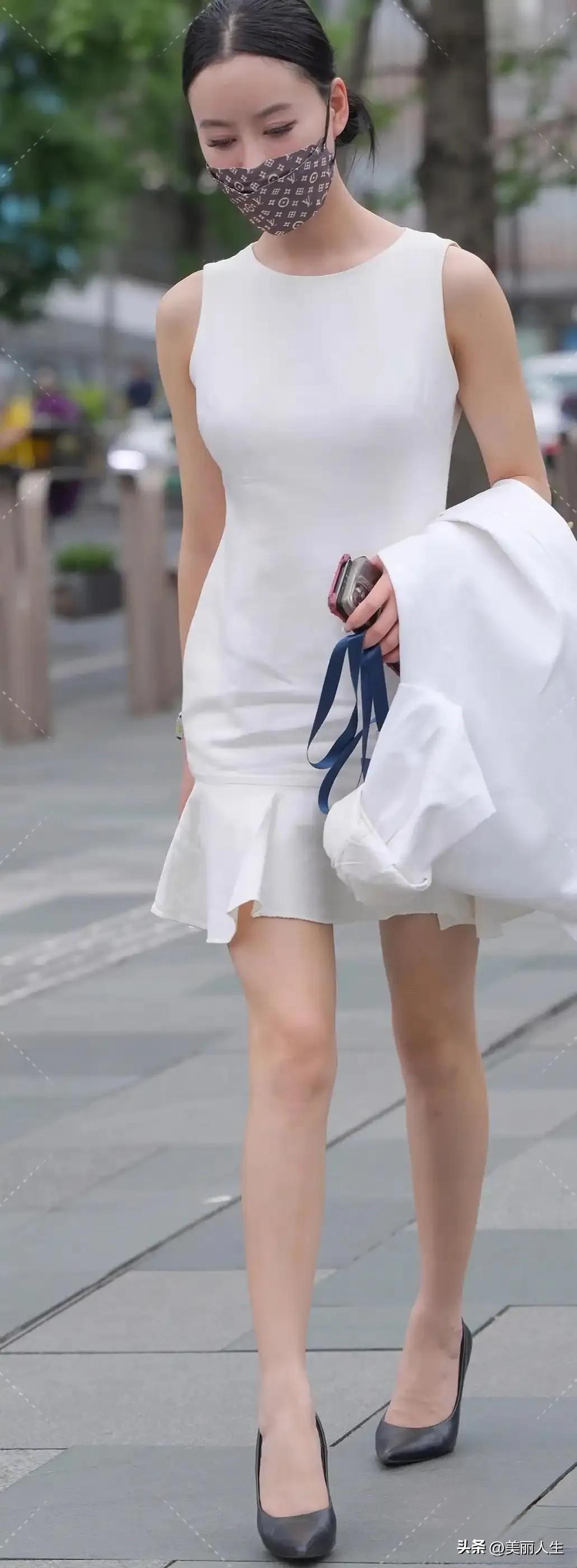 轻盈粉色连衣裙,搭配高跟鞋,漫步在绿意盎然的小巷中。