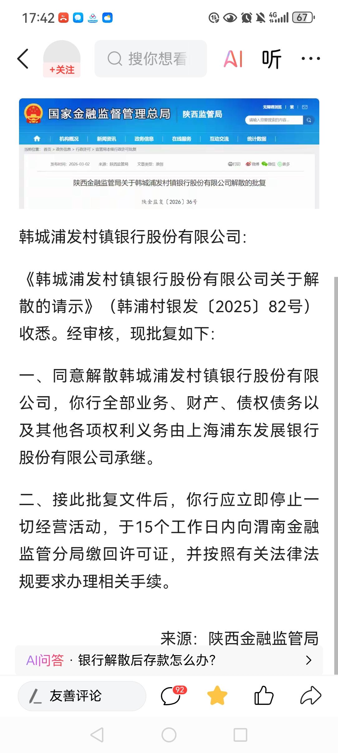 今天看到有个村镇银行解散的消息。 估计是业务少了,不得不解散。 好奇它的存款啊,贷款啊之类的业务什么的怎么处理。 找到官网,国家金融监督总局给的批复是全部业务,财产,债权债务,由上海浦发银行承继。 查了查天眼查,浦发银行持股51%,是大股东。 这样大家就可以放心了。相当于被大银行给整合了。 对储户的唯一的不方便可能是以后取款不方便了,或者跨行取款得交点手续费。