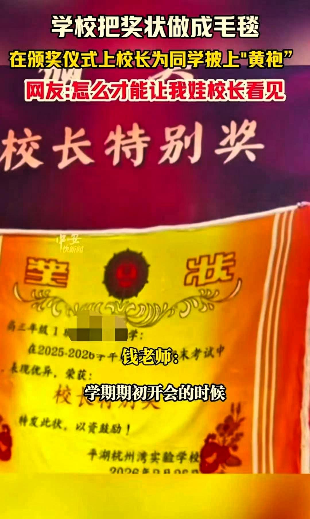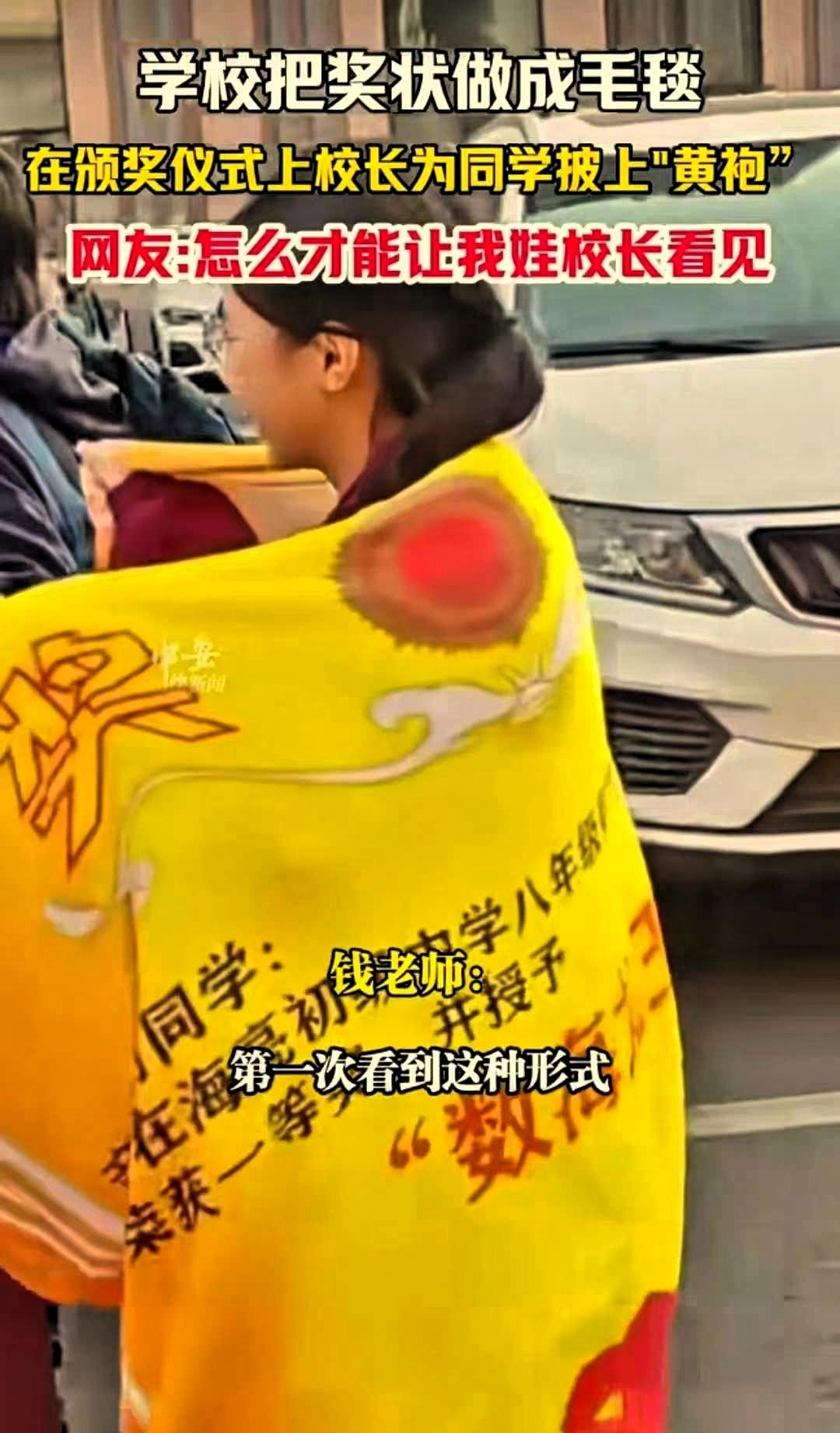 “太有意义了!”浙江嘉兴,一中学在“百日誓师”活动上,为上学期成绩优异的同学颁奖,学校没有沿用传统的纸质奖状,而是将奖状内容印制在毛毯上,每条毛毯都印有学生姓名和获奖信息,具有专属纪念意义。 在活动现场,校长亲自为获奖学生披上毛毯,仪式简洁庄重,既表达了对学生的肯定,也营造了积极向上的氛围。 相比传统奖状,毛毯更具实用性。日常可以作为披肩或盖毯使用,不容易损坏,也方便长期保存。对学生而言,这份奖励不仅是荣誉的象征,更是看得见、用得上的鼓励,能够在学习和生活中时刻提醒自己,曾经的努力值得被记住。 不少网友对此表示认可,认为这样的奖励形式新颖、贴近生活,避免了形式化,让表彰更有温度。大家觉得,实用又有纪念意义的奖品,比单纯的纸质奖状更能打动学生,也更能激发大家的学习动力。 教育的意义,不仅在于传授知识,也在于恰当的鼓励与引导。这所学校用简单的创意,让奖励变得更有价值,让学生真切感受到努力被看见、付出被认可。这种不追求花哨、注重实效与情感的做法,体现了对学生的尊重与关怀。 一张奖状可能会被收纳起来,一条毛毯却能长久陪伴。小小的改变,传递出的是温暖的教育理念,也让百日誓师更有意义。这样务实又暖心的激励方式,值得被更多人看到和肯定。