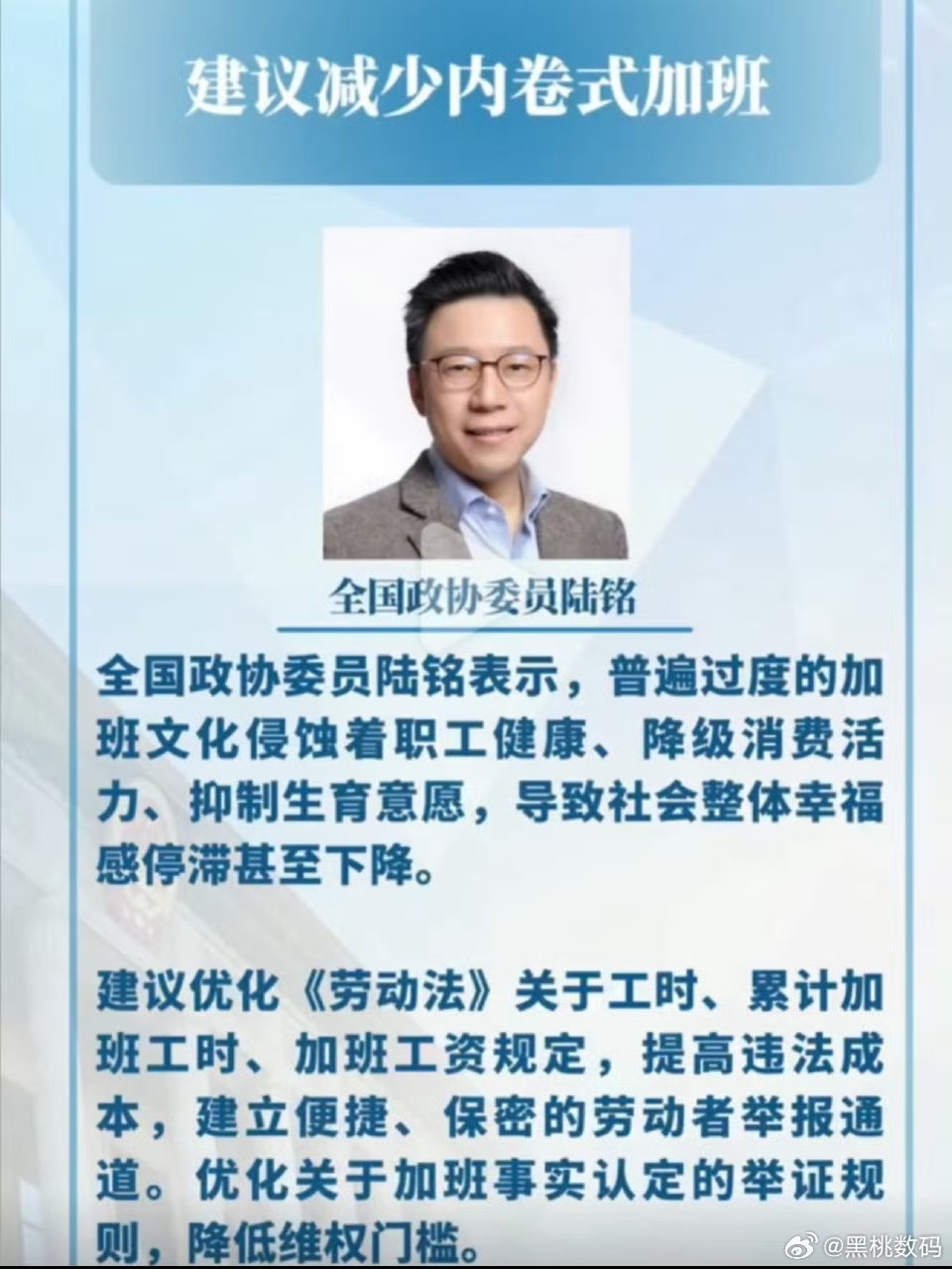 委员建议00后不要进入加班文化“加班光荣”不应该成为一种新的氛围,终于有人站出来说00后职场问题,现在没有加班费并且非自愿的加班已经成了普遍现象,我们就应该在休息时间对加班勇敢说不!
