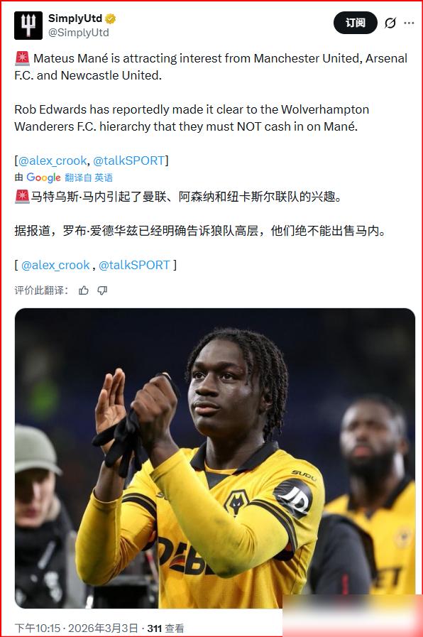 一个保级队教练拍桌子吼着十八岁小孩绝不卖,你听听这扯不扯淡?这纯粹是看准曼联急缺左边锋,死死掐住脖子准备狠宰一刀的连环套。 狼队主帅爱德华兹跑到媒体镜头前放狠话,死保自家青训小将马内。你仔细品品,一支天天愁着留在英超的球队,主教练能决定一笔几千万买卖的死活?这毛头小子本赛季才刚进一线队,勉强混了个一球一助攻的数据。这就差把快来砸钱抬价几个字印在脑门上了。 曼联的左路现在确实是个大窟窿。左脚边后卫只剩下卢克肖和多尔古。偏偏网上一堆根本没看过全场比赛的球迷,跳着脚硬说多尔古是正印左边锋。你随便翻开意甲的录像带或者曼联上半赛季的回放,这哥们干的就是左后卫和左翼卫的活。库尼亚骨子里更是个喜欢去中路活动的左前腰。 球队要想重新玩转四二三一体系,必须掏出一个速度像跑车一样能疯狂往返的正经左边锋。转会市场上八千万欧元的莱奥确实香,但高层攥着预算舍不得砸,反而让狼队抓住了曼联到处乱投医的软肋。十八岁的小马内确实敢拼敢抢,体力就像用不完的柴油机,但指望他来救火,纯属闭着眼睛砸钱。 老特拉福德现在缺的不是刮彩票的盲盒,而是即插即用的真核。这笔所谓非卖品的传闻,根本不是重建红魔的良药,而是吸血保级队的毒药。满嘴跑火车的抬价把戏,真当这帮看透转会市场的老球迷是韭菜。