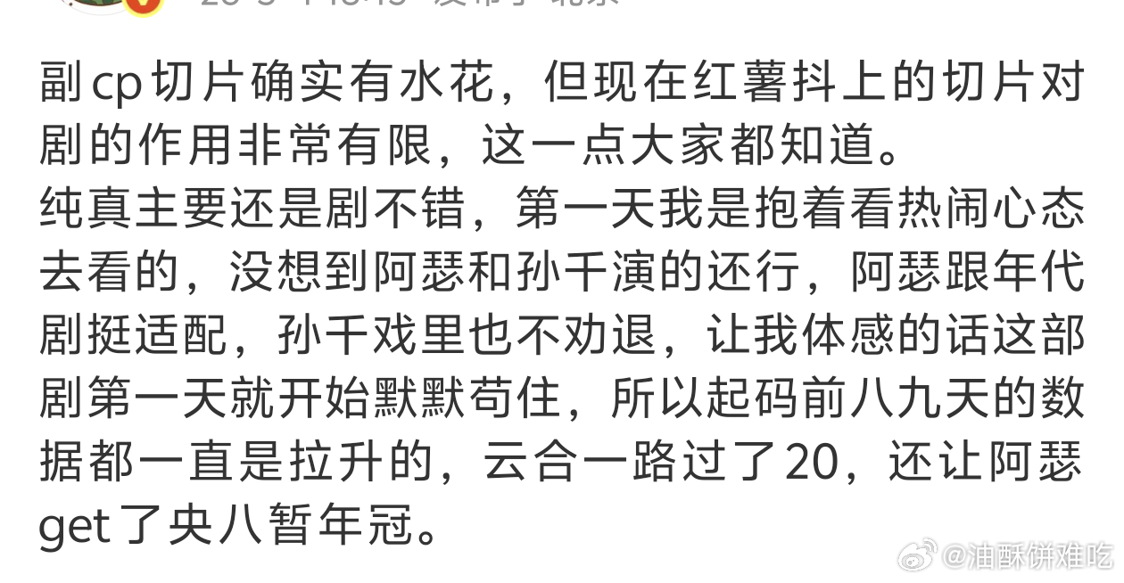 现在切片对一部剧的走势影响非常有限了,何况还是非主角,纯真越播越好肯定是主线剧情给力这点毋庸置疑