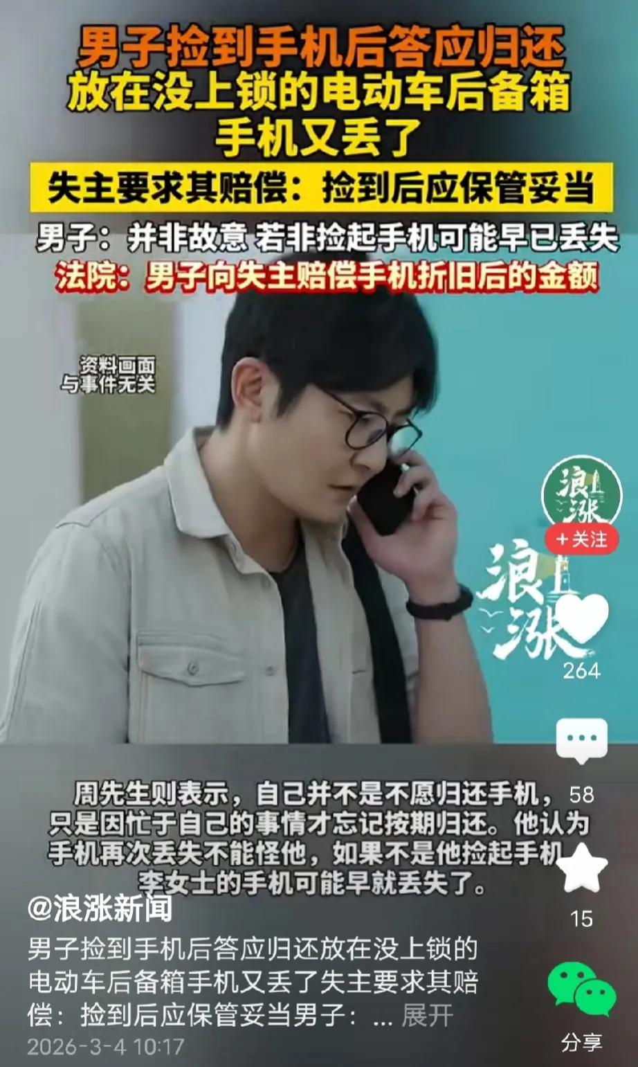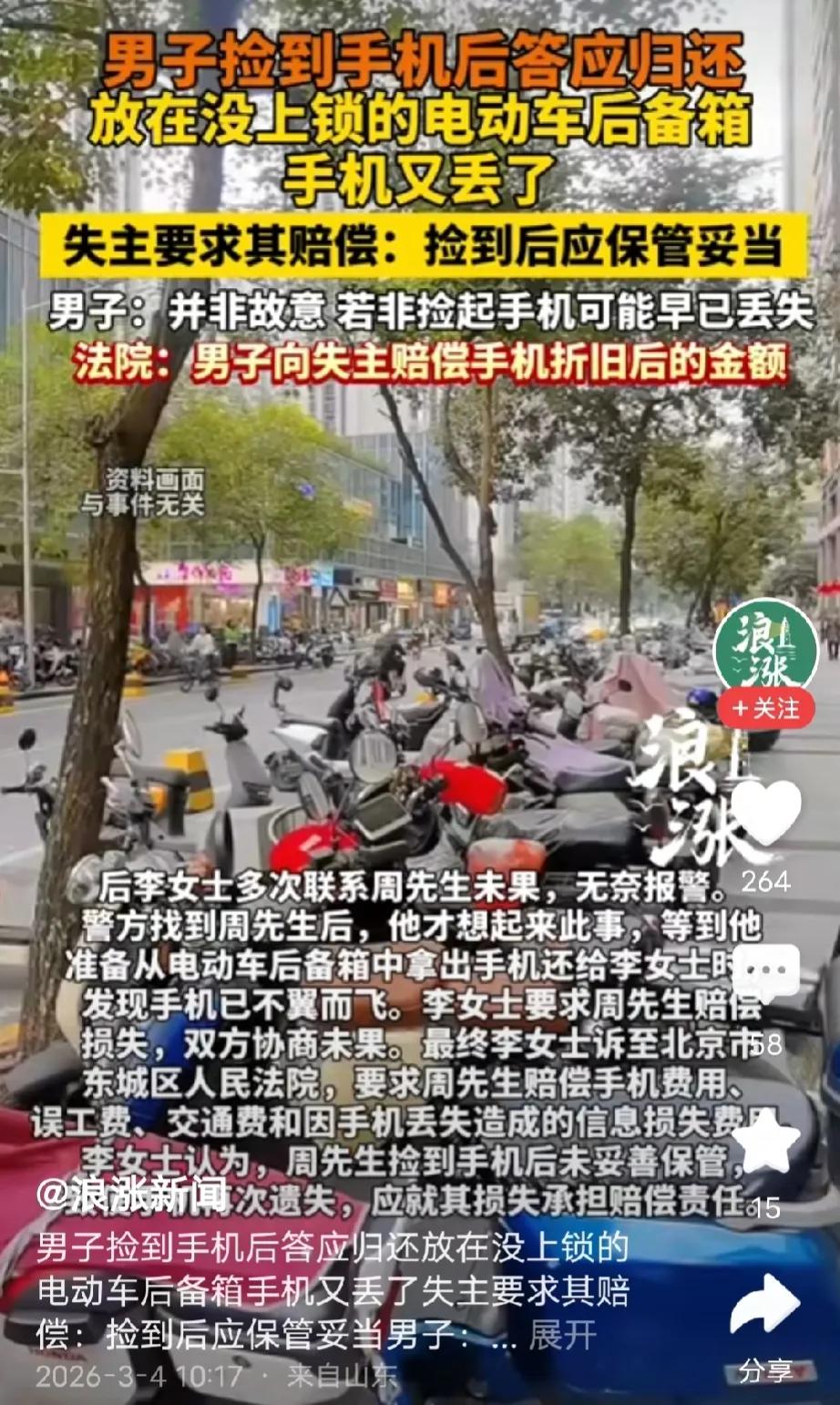 北京,男子捡得一部手机,接到失主电话后,本想归还,谁料,刚好有急事要回老家,就把手机放在电动车后尾箱,失主多日拿不回手机急得报警处理,没想到,男子回来后发现后尾箱的手机被偷了。女子要求男子赔偿,男子可不干,若不是他捡到,手机早就丢了,坚决不赔。女子气不过,告上法庭,法院判决亮了。 2025年9月份的一天,周先生在骑电动车回家的路上,突然看到离他不远处有一个东西闪着亮光,他骑车过去一看原来是一部手机。 他看到手机壳上贴了很多水晶一样的颗粒,那些颗粒在阳光的照射下,发出耀眼的亮光。 周先生四周看了一圈发现空无一人,他估计丢手机的人已经走远了。 周先生只好捡起手机,往家的方向走,就在他准备回到家的时候,那部手机响了。 周先生赶紧按下接听键,是失主打来的,她告诉周先生因为骑车时手机没放好,弄丢了,希望周先生能把手机还给她。 周先生爽快地答应了,不过,他说他有急事需要处理,等忙完了会尽快联系女子。 之后女子告诉周先生她姓李,并给周先生提供了一个号码,让他忙完了尽快归还手机。 周先生挂了电话后,随手就把手机放在电动车后尾箱骑上电动车往家的方向赶。 谁料,周先生回到家后,家人告诉他让他回老家紧急处理一点事。 当天周先生是骑着电动车到地铁口,再乘坐地铁到车站的,而他的电动车就锁在了地铁口。 周先生回到老家后,因为忙着处理事情,一时之间竟然把还手机这事给忘了。 那边李女士迟迟等不到周先生的回信,心急如焚,她打自己的电话起初是不接听,后来直接关机了。 再多次联系不上周先生后,李女士火了,他认为周先生是故意失联,想私吞手机,直接报警处理。 警方通过调查该路段的监控,最终锁定嫌疑人周先生。 周先生面对民警的询问,赶紧去电动车后尾箱找,当他打开后尾箱,才发现里面空空如也,李女士的竟然手机被偷了。 李女士又气又无奈,手机被偷了是张先生没保管好,他有责任,所以得赔偿。 张先生觉得很冤,凭什么让他赔?要不是他捡到,手机早就丢失了,坚决不赔。 李女士气不过,把周先生告上法庭,要求赔偿手机费用、误工费、交通费还有因手机丢失造成的信息损失费。 而法院经过审理认为,周先生捡得手机后,没及时归还未做到妥善保管义务,也没有交到派出所,他的行为属于故意或者重大过失致使遗失物毁损、灭失的,应当承担民事责任。 最终法院判处周先生赔偿手机折价费。 从情理上说,这事其实两边都有点委屈。周先生本来是好心捡手机,也答应归还,没想着占为己有,结果临时有事回老家,把手机放尾箱忘了,回来还被偷了,自己也觉得冤。 但李女士丢了手机,一直联系不上,最后还没了,肯定着急又生气。 虽然周先生是好心,但捡到东西就有责任保管好,不能随便一放就不管了。 他没尽到看管责任,最后手机丢了,于情于理都该承担点赔偿,法院这么判,也是在提醒大家,做好事也得负起责任。 《民法典》第316条规定,拾得人在遗失物送交有关部门前,有关部门在遗失物被领取前,应当妥善保管遗失物。因故意或者重大过失致使遗失物毁损、灭失的,应当承担民事责任。 本案中周先生捡到手机后答应归还,却将手机随意放在电动车后备箱,长期不妥善保管也未送交派出所,属于未尽到妥善保管义务,存在重大过失,最终导致手机被盗,符合法条中应当承担责任的情形,所以法院判决他赔偿手机折价费用是合法合理的。 对此,大家怎么看?