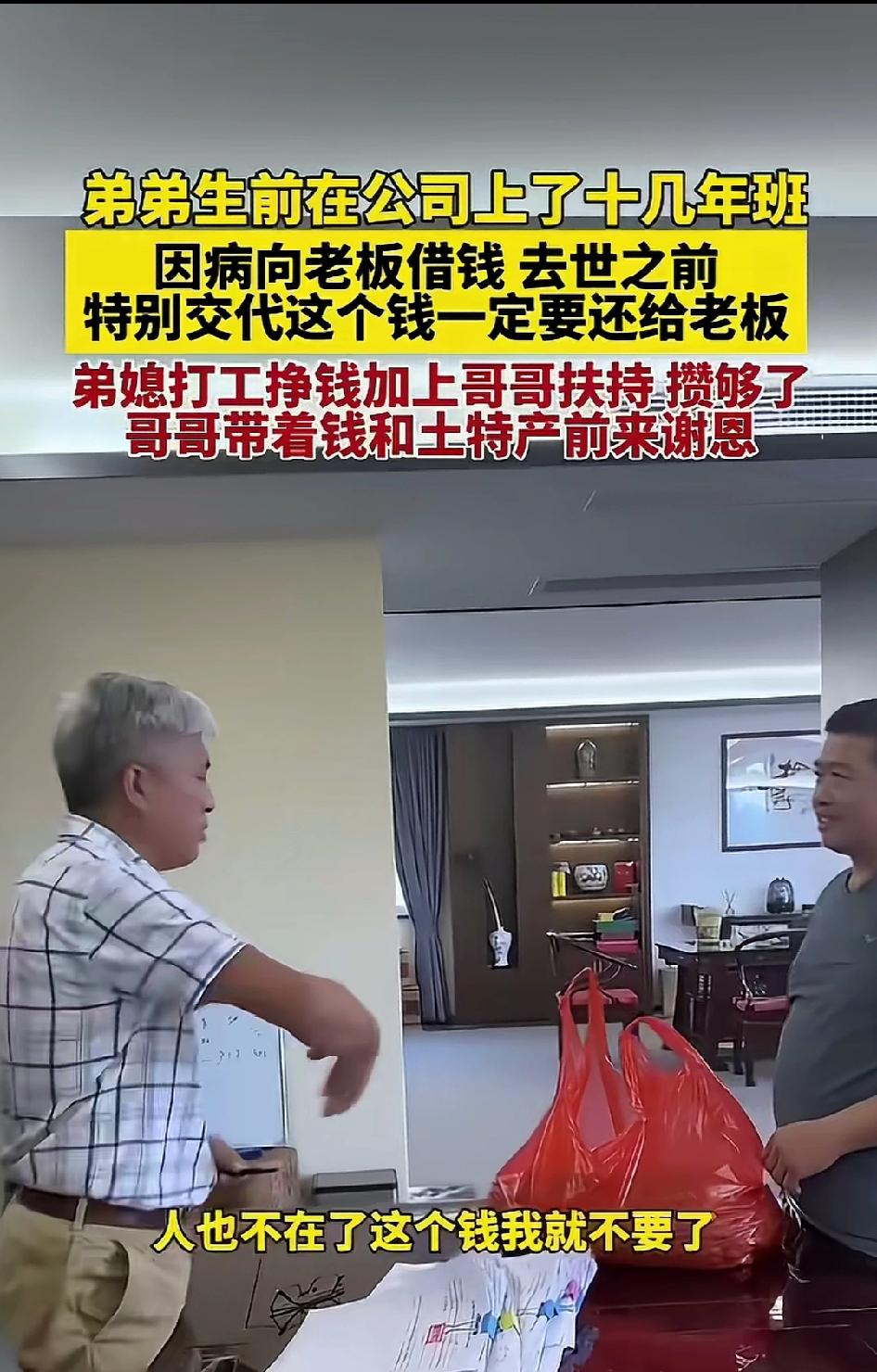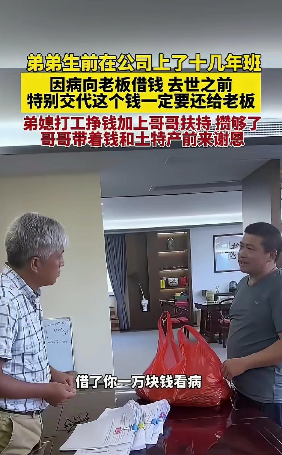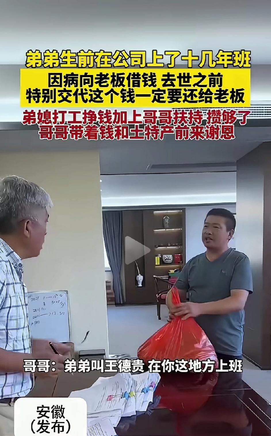 泪目! 安徽一位在工厂踏实干了16年的老 员工王德贵,重病时老板二话不说借出1万元,无欠条、无利息。男子临终唯一嘱托:钱一定要还,人走信用不能丢!弟媳咬牙打3份工,半年凑齐欠款,可老板的举动看哭全网 2023年初,平静的日子被一张诊断书狠狠打碎。 王德贵莫名持续消瘦、浑身无力,去医院一查,竟是重病。 这个消息,对本就普通的家庭来说,无异于晴天霹雳。 家里所有积蓄,瞬间砸进医院,买药、检查、治疗,像流水一样花光,很快就到了拿不出钱的地步。 王德贵在这家工厂一干就是整整16年。 他话少、肯干、不耍滑、不偷懒,脏活累活抢着上,交代的事件件有回音,年年都是厂里的骨干,是老板心里最踏实、最放心的老员工。 16年里,他把工厂当成第二个家,把老板当成值得信任的人。 老板得知他病倒、家里已经拿不出钱治病,当场没有一丝犹豫。 他立刻从抽屉里拿出10000元现金,直接塞到王德贵手里,语气坚定又暖心: “先治病,什么都别想,你的岗位我给你留着,等你好起来。” 没有写借条,没有约定还款日期,没有提一句利息,甚至没有一句“记得还我”。 在他心里,16年的情分,早已比这一万块钱重得多。 王德贵双手接过钱,手指都在发抖,眼泪当场就掉了下来。 他哽咽着,一遍又一遍跟老板保证: “你放心,这钱我一定还,我病好就上班,绝不能让你吃亏。” 他把这份恩情,死死记在心里,也把这笔账,刻在了心上。 可病魔无情,治疗苦苦支撑了大半年,还是没能留住他。 2023年9月,王德贵走到了生命最后一刻。 弥留之际,他已经虚弱得说不出几句完整话,脸色苍白,呼吸微弱,却用尽全身最后一点力气,紧紧攥着哥哥的手,眼神倔强又认真,一字一顿,拼尽全力留下遗言: “老板的那1万块……一定要还…… 人走了……信用不能丢……” 这是他留在世上,最后一句完整的话。 在场家人,全都哭成泪人。 他到死,念的不是苦,不是痛,而是不能欠别人的钱,不能丢做人的信义。 为了完成弟弟最后的遗愿,一家人从此拼上了全部。 弟媳更是把自己逼到了极限。 一个女人,硬生生扛起三份工: 白天进工厂流水线,一站就是一整天; 晚上去做保洁,擦地、倒垃圾、打扫楼道,忙到深夜; 周末别人休息,她继续打零工,能挣一块是一块。 每天睡不到5小时,累到站着都能打瞌睡,胳膊酸得抬不起来,脚底磨出一层又一层水泡。 她不敢停,不敢歇,更不敢抱怨,心里只有一个念头: 快点攒钱,快点还清,不能让丈夫走得不安心,不能丢了他家的诚信。 孩子托付给大伯照顾,她自己省吃俭用到极致: 饭菜能省则省,衣服能穿就不买,一分钱都掰成两半花。 哥哥也全力支撑,每月从自己微薄工资里,硬生生挤出一部分,全部贴进去帮弟弟还债。 就这样,一个家,省吃俭用、拼死拼活,仅仅半年时间,硬是一分一毛,凑齐了整整10000元。 2024年3月,哥哥小心翼翼,用一块红布把钱包得整整齐齐,又带上老家最实在的土鸡蛋、手工挂面,带着弟媳的嘱托,专程赶到工厂。 见到老板那一刻,哥哥把红布包郑重递过去,声音哽咽: “老板,这是德贵欠你的1万块,我们给你送来了。” 老板当场愣住,好半天没反应过来,随即连连摆手,推着钱不肯收: “人都不在了,这钱我绝对不要!就当我这个老伙计,最后帮他一把,你们日子本来就难,快拿回去!” 这笔钱,他早就当成了帮助,从始至终,就没打算要回来。 可哥哥站在原地,一动不动,态度坚定,眼神诚恳: “老板,您的心意我们记一辈子! 但德贵走的时候,交代得清清楚楚,钱要还,情更要记。 我们再苦,也不能失信于人,不能让他走得不安心。” 一句话,说得老板瞬间红了眼眶,再也说不出拒绝的话。 他被这一家人刻在骨子里的诚信,狠狠戳中内心,含泪收下了这笔沉甸甸的钱。 本以为事情到此结束,可老板接下来的举动,再次看哭全网。 他悄悄私下准备了5000元慰问金,送到弟媳手里;之后又时常自掏腰包,送去米、面、油等生活用品,持续默默帮扶。 钱,他收下了,那是信义; 情,他用另一种温柔,全部还了回去。 消息来源:舜网发布 及网络公开内容,本文配图/视频素材来自舜网发布 ,以上仅用于内容分享,侵权即删,谢谢!