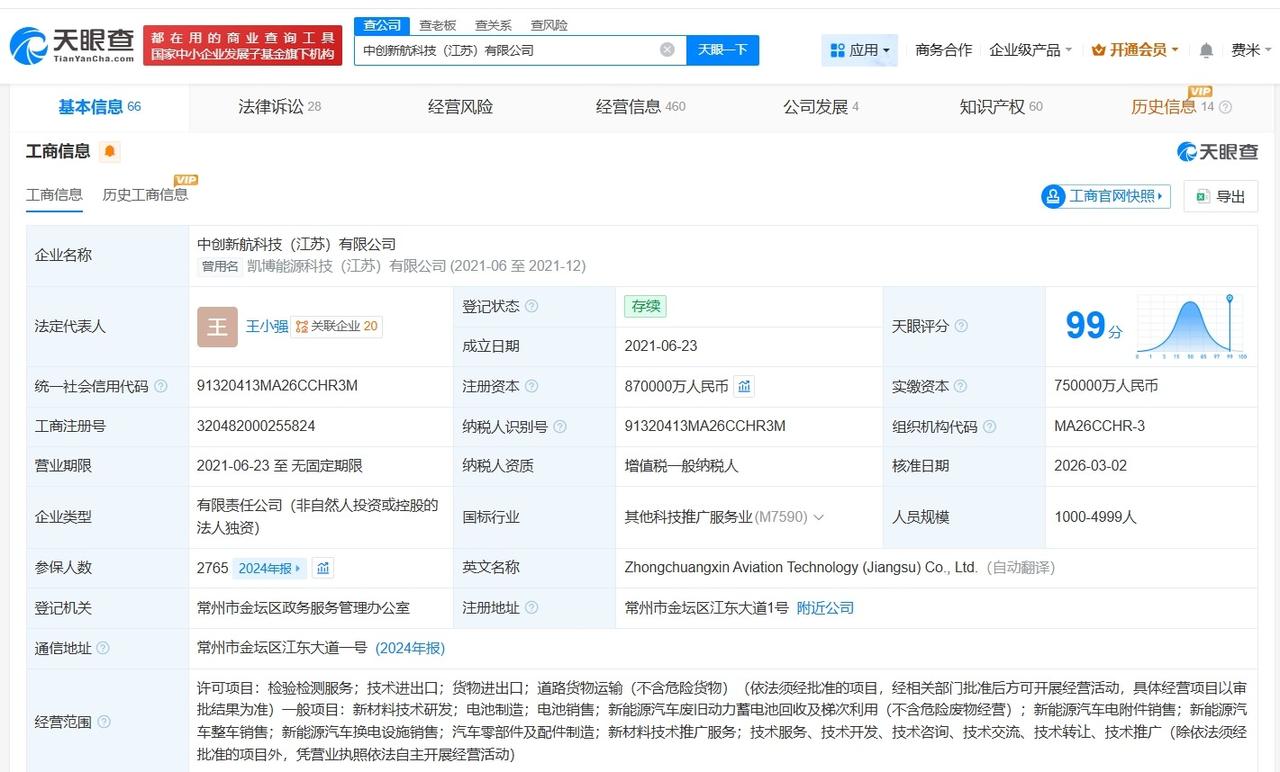 中创新航旗下江苏科技公司增资至87亿 增幅16% 天眼查工商信息显示,近日,中创新航科技(江苏)有限公司发生工商变更,注册资本由75亿人民币增至87亿人民币,增幅16%。 中创新航科技(江苏)有限公司成立于2021年6月,法定代表人为王小强,经营范围包括电池制造、电池销售、新材料技术研发、新能源汽车废旧动力蓄电池回收及梯次利用等。股东信息显示,该公司由中创新航(03931.HK)全资持股。 天眼查信息: