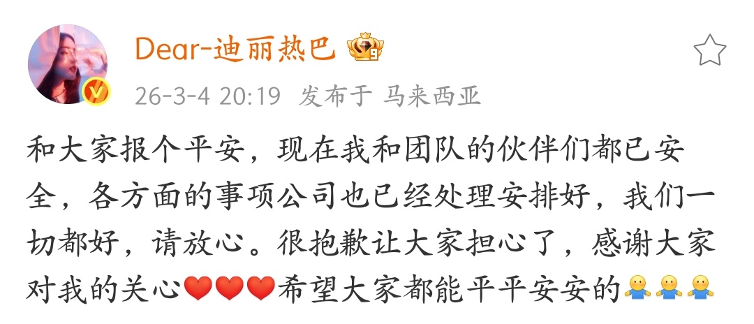 迪丽热巴发文报平安了!!!IP在马来西亚,安全就好等你回来