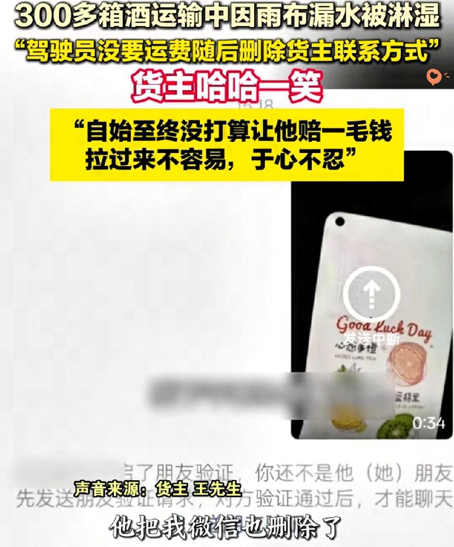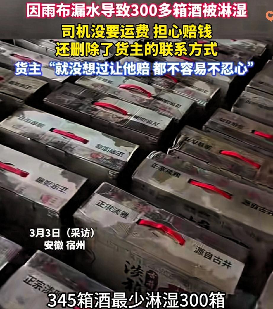 安徽这位老板的格局,真的甩司机十条街! 345箱酒运到后300箱被淋湿,司机甩下340元运费溜之大吉,还拉黑删除微信,反观老板的做法,暖心到让人破防。 按法律规定,雨布没盖好导致货损,司机本就该承担责任。 可王先生从没想过索赔,还心疼司机熬夜跑车不容易,说大不了拆箱散卖、便宜处理。 司机怕赔几万块就逃避,却忘了成年人做事该有担当——其实好好沟通,未必需要承担巨额损失,反而能留住客户。 而王先生算的从不是金钱账,是将心比心的人情账,这份厚道比盈利更珍贵。 生活里的纠纷大多如此,责任要认,但人情也该留余地。你遇到过这种得理饶人的暖心事吗?