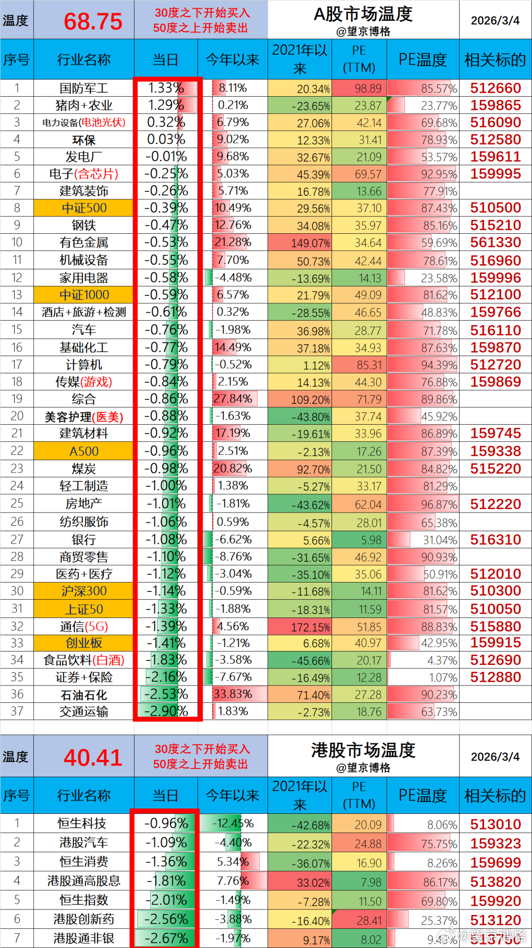 “想知道郑大昨天,为什么不像去年4/7那样大举加仓?”博格只能回答:“那时候大盘才3000点,现在已经4000点,现在这个位置估值不便宜了,不适合大举加仓了”。其实今年以来,博格都是在持续慢慢减仓了,例如减仓军工、减仓资源。真的没办法事先预测到最近的市场大跌。既然已经大跌了,就不着急继续减仓了,等市场涨起来创新高了再继续减仓。今日温度:A股今天68.75度,相比上一个交易日下降0.8度;港股今天40.41度,相比上一个交易日下降2.0度;今天又是抱团取暖的一天~欢迎大家留言吐槽,也感谢大家的点赞与点爱心~基金恒生科技