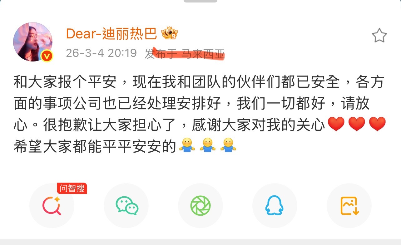 迪丽热巴发文报平安了,位置在马来西亚!前几天迪丽热巴滞留迪拜,王楚然工作室发了巴黎不是用来转机的引发热议! 迪丽热巴报平安