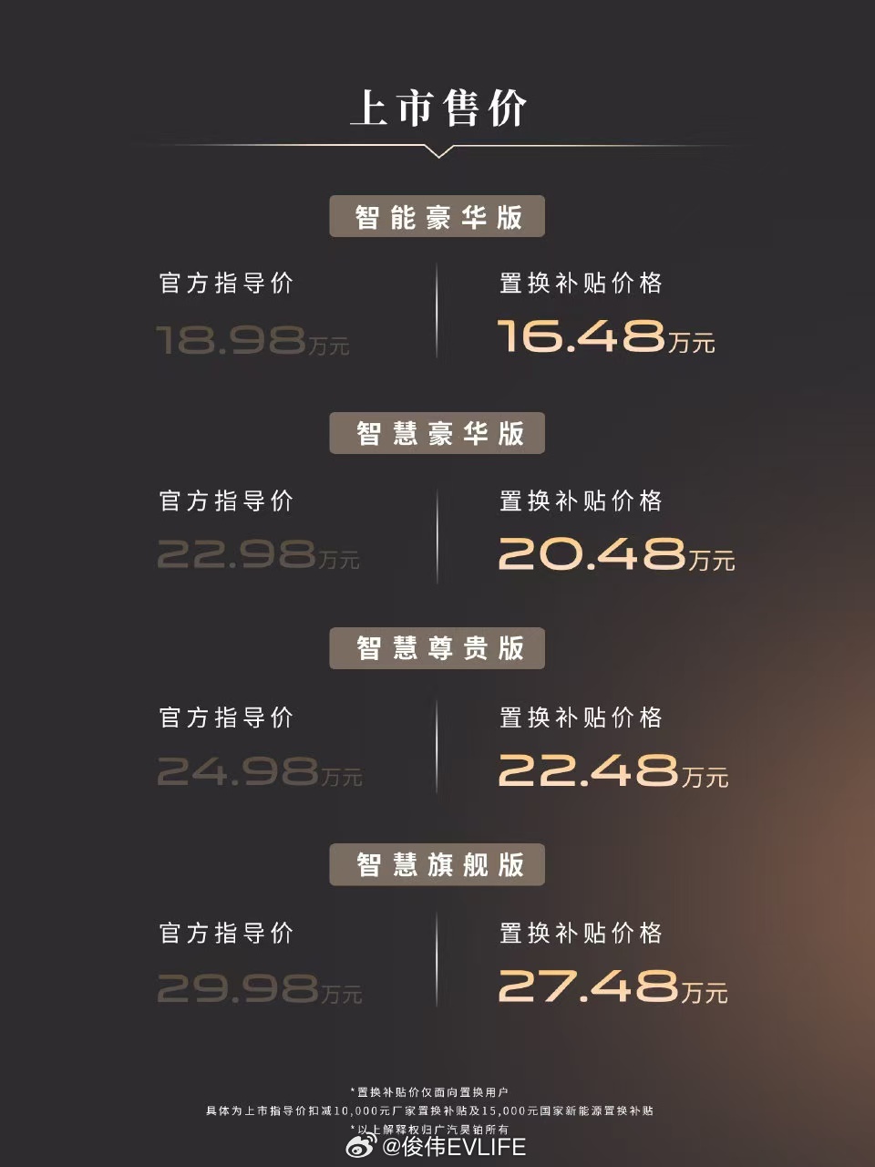 - 华为乾崑智驾ADS 4.1 + 鸿蒙座舱5;- 896线激光雷达,全球量产最高,与尊界S800同款;- 四激光雷达方案,上市即搭载!