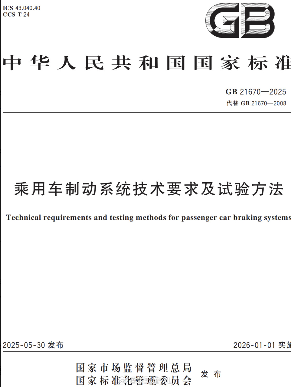 GB 21670-2025 乘用车制动系统技术要求及试验方法,在25年年中发布,在法规层面确立线控制动(含 EMB)的技术要求与试验方法,适用于乘用车,覆盖电子机械制动、线控踏板、冗余制动等。