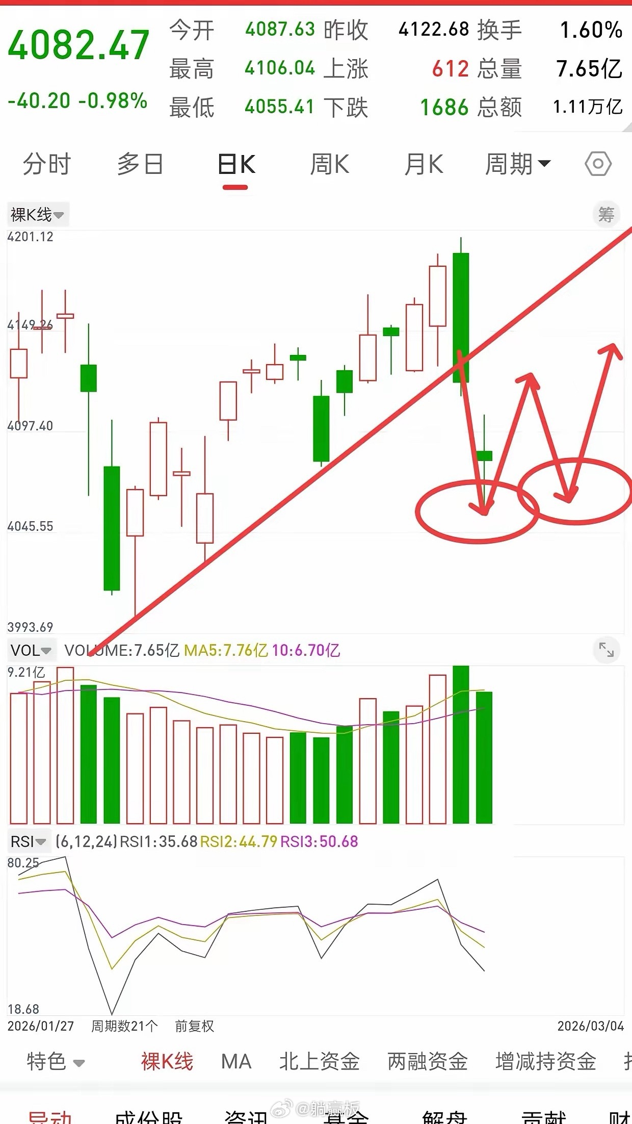 说白了,买点只在下跌中产生,反弹是没有买点的,4050附近是第一个买点,第二个买点是4010附近。