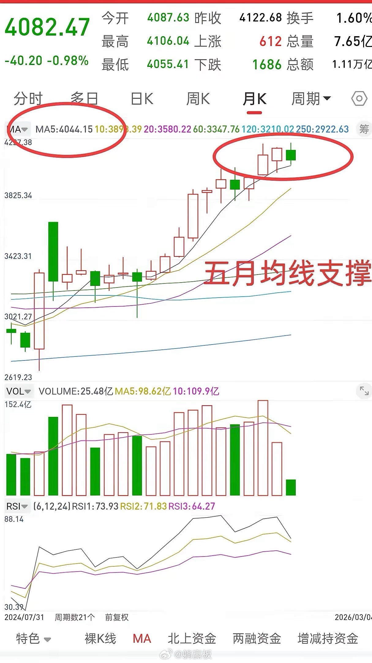 今天最低点4055,为什么跌到这里不跌了,因为五月均线支撑就是这附近,支撑就是支撑,支撑破了,会加速下跌,支撑不破,到这附近就会反弹。