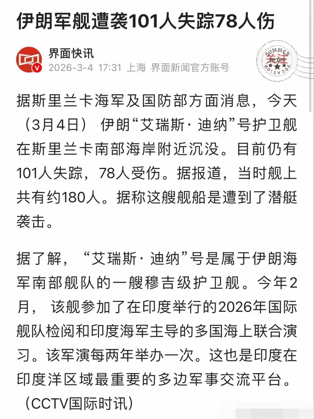 突发噩耗!伊朗护卫舰遭潜艇袭击沉没,101人失踪伤亡惨重🔥 就在刚刚央视国际时讯权威发布:3月4日,伊朗艾瑞斯·迪纳号护卫舰在斯里兰卡南部海域沉没,舰上约180人101人失踪78人受伤斯里兰卡军方证实,该舰疑似遭潜艇袭击。 这艘刚参加完印度多国联合演习的主力战舰,在远海航行途中突遭重击短短时间内沉没,官兵几乎没有反应时间一场和平航行瞬间变成人间悲剧。 当前美伊对抗持续升级伊朗海军本就处于实力劣势,却要在远离本土的印度洋执行任务如今付出血的代价。百余名士兵生死未卜背后是一百多个破碎的家庭。 战争从来没有赢家受苦的永远是普通军人与平民。愿逝者安息真相早日水落石出冲突早日平息!