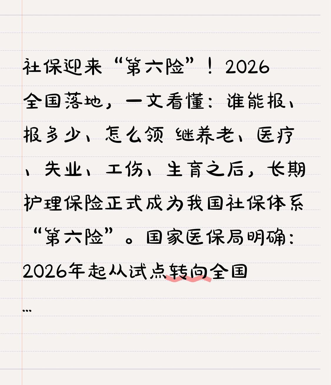 社保迎来“第六险”!2026全国落地,一文看懂:谁能报、报多少、怎么领 继养老、医疗、失业、工伤、生育之后,长期护理保险正式成为我国社保体系“第六险”。国家医保局明确:2026年起从试点转向全国建制,覆盖近3亿参保人,累计惠及超330万失能群众,年人均减负约1.2万元。这不是商业险,是国家普惠保障,家家用得上、人人能参保。 长期护理保险,核心解决一人失能、全家失衡难题。医保只管治病,养老金难覆盖长期照护,而长护险专门兜底:吃饭、穿衣、翻身、洗澡等生活照料,以及压疮护理、康复指导、用药提醒等医疗护理,国家统一36项服务目录(20项生活照料+16项医疗护理),居家、社区、机构护理都能报。 谁能享受?满足三点即可:正常参保医保+失能持续6个月以上+评估为中度/重度失能。因年老、疾病、伤残导致生活无法自理,经官方评估达标,就能享受待遇,重点保障重度失能人员,困难群体报销比例再上浮。 缴费极低,无需单独申请。职工随医保自动参保,总费率0.3%,单位与个人各缴0.15%,每月仅十几元;居民医保参保人同步纳入,个人年缴几十元,财政补贴大头;退休人员从医保账户代扣,不用额外掏钱。 报销清晰透明:职工报销约70%,居民45%-55%,居家护理比例更高,不设起付线,评估费由基金全额承担。按年度限额保障,重度失能年度限额不低于当地居民人均可支配收入的50%,部分城市可达3万元,直接与定点机构结算,个人只付自费部分。 怎么办理?四步走:1. 查询参保状态(社保APP可见长护险缴费);2. 向医保窗口/线上提交申请;3. 等待专业人员上门评估;4. 选定服务模式,享受待遇。全程公开规范,有政策依据、有标准可依、有流程可循。 第六险落地,是社保体系的关键补位。它不只是一份保障,更是家庭尊严与生活底气。花小钱、保大险、护全家,让失能人员有照料,让家人少负担。建议大家主动查询参保状态,吃透政策,早知晓、早准备、早受益。国家社保新规 新社保条例