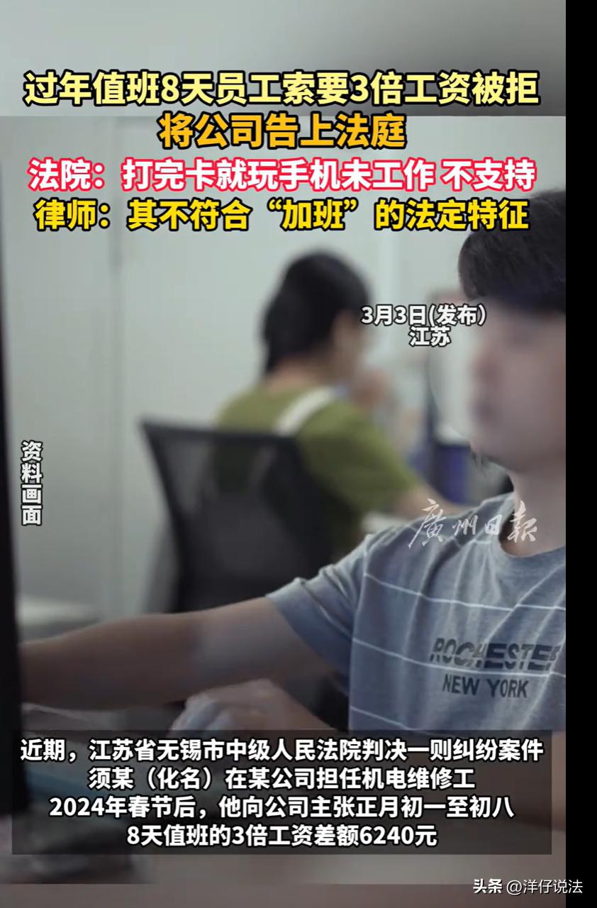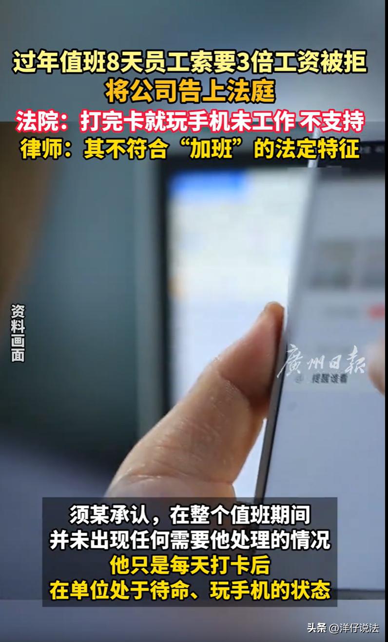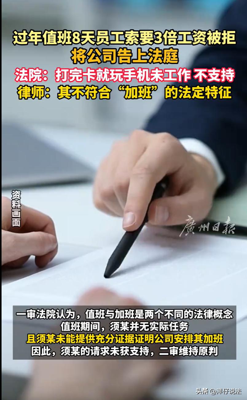 “到底是值班,还是加班?”江苏无锡,一维修工师傅称春节被安排了特殊任务,从大年初一到初八,整整8天,他每天雷打不动到公司打卡,然后窝在值班室里刷手机、等活儿。师傅心里盘算着:这可是法定节假日,8天三倍工资,小六千块钱稳稳揣进兜里。哪知道节后找公司要钱,对方两手一摊:你啥活儿没干,还好意思要加班费?师傅不服,直接把公司告上法庭。法院这样判决。 据悉,2023年8月,须师傅到一家销售公司上班,干的是机电维修的活儿。 2024年春节,大伙儿都盼着回家团圆,可公司这头,厂房、设备在那儿摆着,万一春节期间出点啥事儿,没人及时处理,损失可就大了。 须师傅称被安排了这么个差事,从大年初一一直到大年初八,一共8天。 春节过完,该上班了,须师傅就跟公司提出来,说我这8天可没闲着,在公司值班呢,按法律规定,法定节假日加班,得给三倍工资,大概要6240块钱。 公司一听,不干了。 公司说,我们压根儿就没安排你春节值班,你凭什么来要钱?再说了,就算你在单位,也是自己玩手机,什么事儿都没干,这也算加班? 两边谁也说不服谁,工资肯定也没发。 须师傅一气之下,就把公司告上了法庭,要求公司支付这8天的三倍加班工资。 案子到了法院,一审开庭。 法庭上,须师傅也挺实在,他说,我就是在公司“值班”,主要任务就是应对特殊情况,比如哪儿坏了需要紧急救援,或者做个普通维修。 说白了,就是“养兵千日,用兵一时”,人得在,活儿不一定有。 但是,须师傅也承认,这段时间,一次救援任务也没有,一次维修也没有,就是每天到公司打个卡,然后在单位待着,主要是玩手机,随时准备着,但一直没等到活儿。 公司还是咬死了那句话:我们没安排你值班。 法院会如何判决呢? 《劳动法》第四十四条规定,有下列情形之一的,用人单位应当按照下列标准支付高于劳动者正常工作时间工资的工资报酬:……(三)法定休假日安排劳动者工作的,支付不低于工资的百分之三百的工资报酬。 《最高人民法院关于审理劳动争议案件适用法律问题的解释(一)》第四十二条规定,劳动者主张加班费的,应当就加班事实的存在承担举证责任。但劳动者有证据证明用人单位掌握加班事实存在的证据,用人单位不提供的,由用人单位承担不利后果。 一审法院指出,须师傅虽于2024年2月10日至17日期间每日到公司打卡,但其本人当庭自述,这8天里“未出现任何需要他处理的情况”,其状态为“每天打卡后在单位处于待命、玩手机的状态”。 这种工作状态与法律意义上的“加班”存在本质区别。加班,是指劳动者在法定工作时间之外,根据用人单位的安排,继续从事与本职工作内容、强度相当的劳动。 而值班,通常是指用人单位因安全、消防、节假日值守等需要,安排劳动者从事与本职工作无关或强度明显较低的临时性、预备性工作。 从工作内容看,须师傅日常承担机电维修,强度较高;而值班期间仅是“玩手机待命”,无任何实际维修任务。 从工作强度看,加班期间劳动者基本无法休息,而须师傅在值班期间处于随时可休息的状态。 从工作目的看,加班是为了完成生产经营任务,值班则是为了防范突发风险。 一审法院认为,须师傅的行为在法律定性上应认定为“值班”,而非“加班”。 关键是,须师傅主张加班费,仅提供了打卡记录。 然而,打卡记录仅能证明其“在场”,无法证明其“在提供岗位对价劳动”,对于用人单位是否安排其“加班”、其是否实际从事了“加班劳动”等核心事实,须师傅未能提供公司发出的加班通知、任务安排记录等初步证据。 同时,用人单位明确否认安排须某加班。 最终,一审法院认为须师傅举证不能,驳回其全部诉求。 一审输了,须师傅不服,又上诉到中院。 在二审法庭上,须师傅还是坚持其看法:因其春节8天都正常出勤打卡了,公司就应该给其支付工资,而且是三倍的。 言外之意,只要人去了,打卡了,公司就得付加班费。 然而,二审法院和一审法院观点并无本质区别。 二审法院进一步认为,根据双方的说法,基本上可以认定须师傅这8天确实是在“值班”。但是,值班期间的工作内容、强度,和他正常工作有本质区别。 一审法院根据这些事实和证据,认定公司不用额外支付加班费,这个判决是合理的,没什么问题。 最终,二审法院认为一审法院结合查明事实和法律规定,驳回其诉讼请求,认定事实清楚,适用法律正确,依法予以维持。 有人替须师傅鸣不平,大过年的,人家都在家吃饺子看春晚,他跑到单位干坐着,8天时间就这么搭进去了,凭啥不算加班? 还有网友调侃,啥活儿没干还想拿三倍?想啥呢!我过年加班累死累活才拿那么多,他在那儿刷了8天抖音就想跟我拿一样的钱?天底下哪有这好事! 对此,你怎么看?