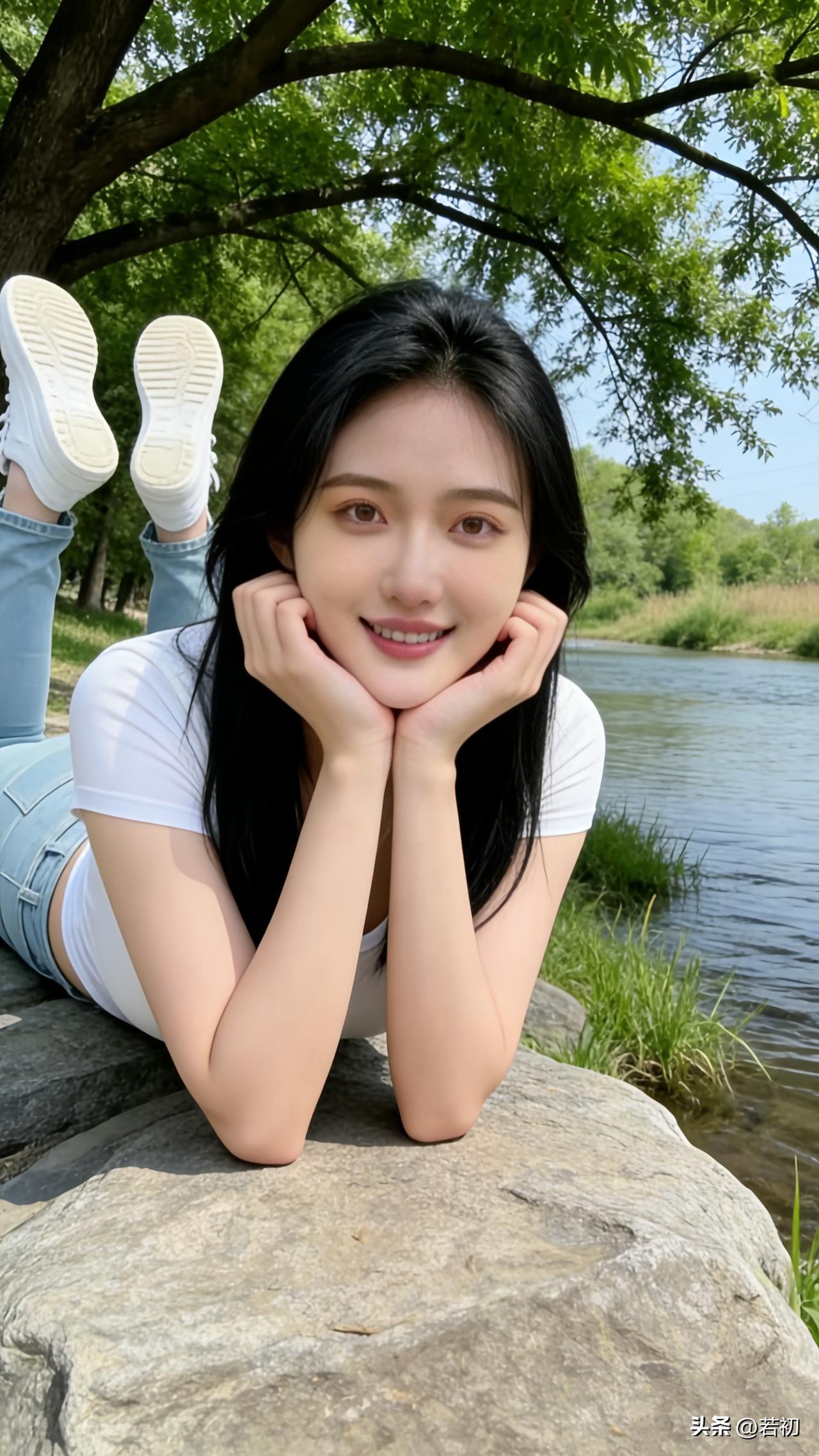 18岁少女在山间小溪边的时光,轻倚石上,笑靥如花,青春靓丽,美丽动人。