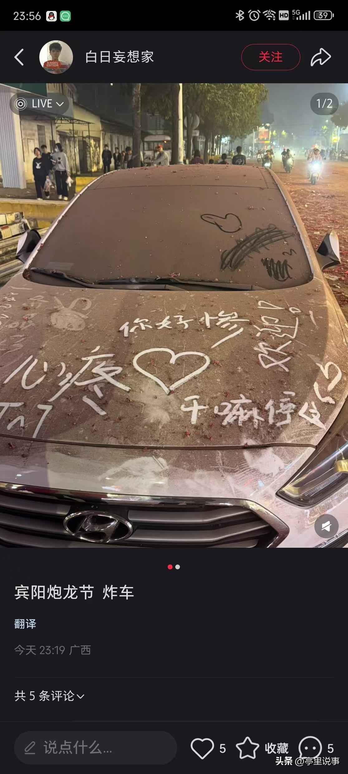 分享我这周有趣的事: 广西宾阳炮龙节最惨的车 这是炮龙节游行队伍必经之路上停着的一辆私家车,整个车身布满了鞭炮燃烧后的灰烬,而且被人怜惜地写上“心疼💜干嘛停这?” 广西 宾阳 炮龙 汽车