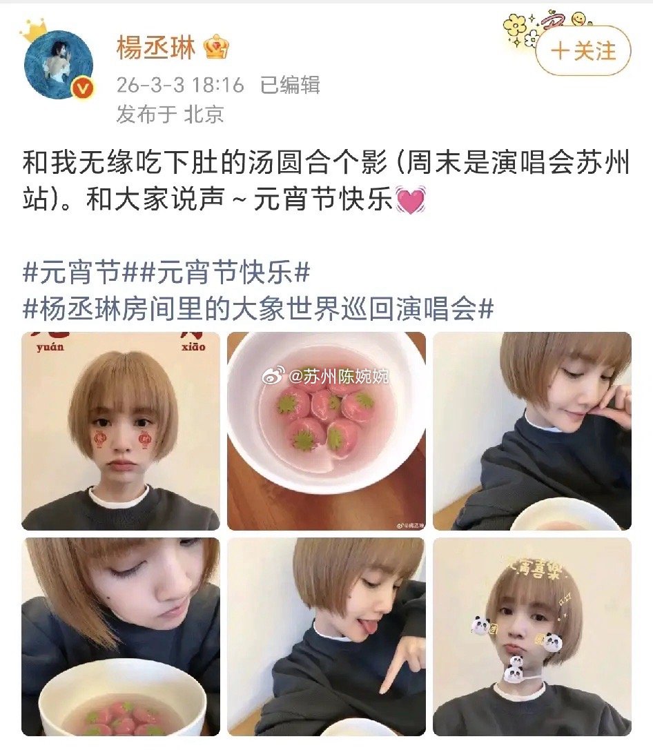 杨丞琳晒与无缘下肚的汤圆合影!3月3日,杨丞琳在社交平台晒出了多张可可爱爱的照片,还有和汤圆的合影。她发文:“和我无缘吃下肚的汤圆合个影(周末是演唱会苏州站)。和大家说声~元宵节快乐💓…”这是为了演唱会,开始注意饮食的节奏呀。 这是草莓汤圆吗?好可爱的一颗颗小汤圆。开完演唱会可以补上哟!