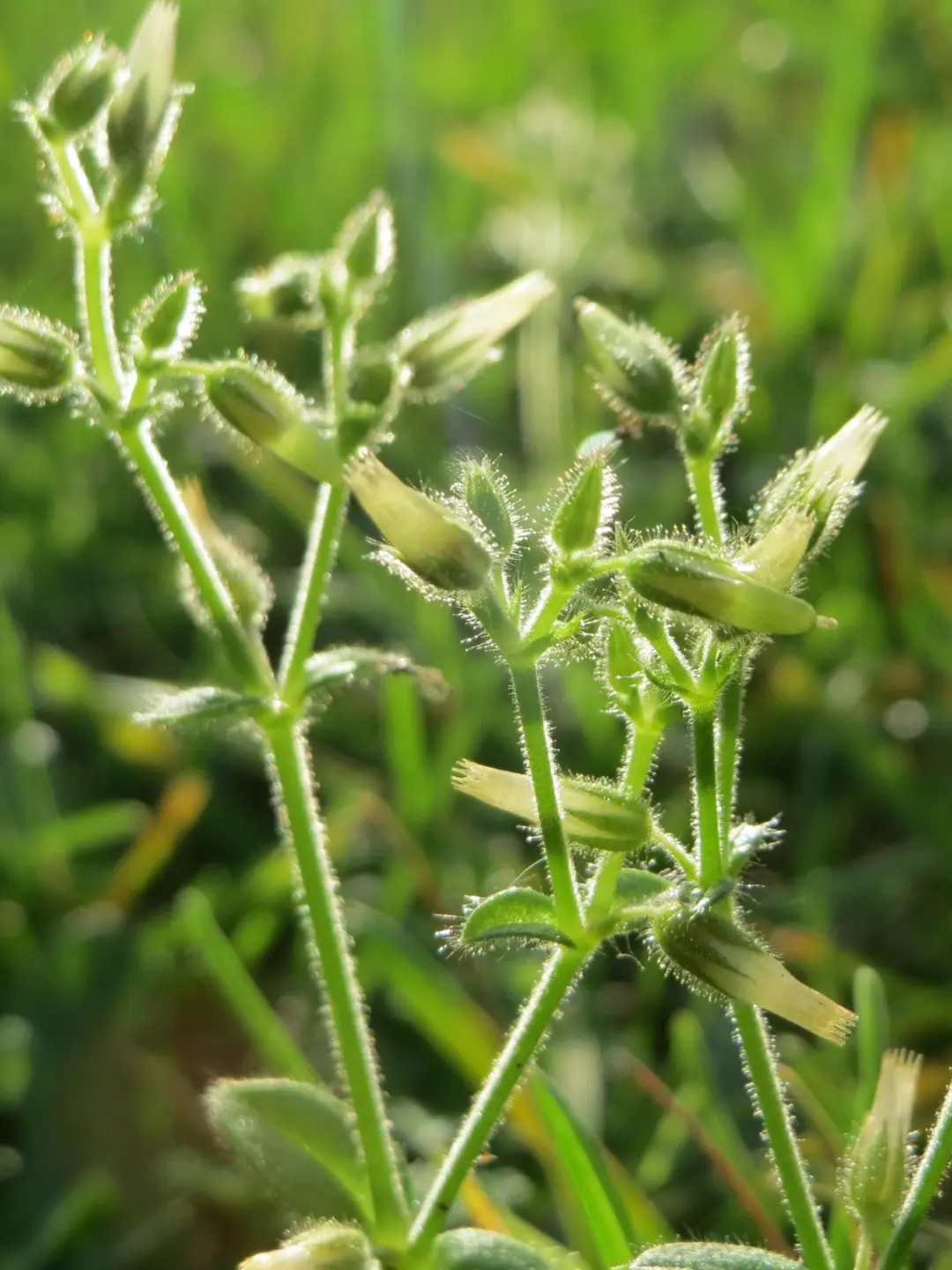 与繁缕相比,球序卷耳有两个明显不同的地方:繁缕的花瓣裂到底端,像v字形(图7),球序卷耳花瓣浅裂,看起来仍然是五瓣花瓣;繁缕几乎无毛,球序卷耳则全身都是毛绒绒的(图1-6)。作为几种广布的早春野花,它们都是食草动物喜爱的食物,在农村常被割来喂养家禽家畜。而它们咋依靠强大的繁殖能力,在短暂的一生中结出大量种子,一直繁衍至今。