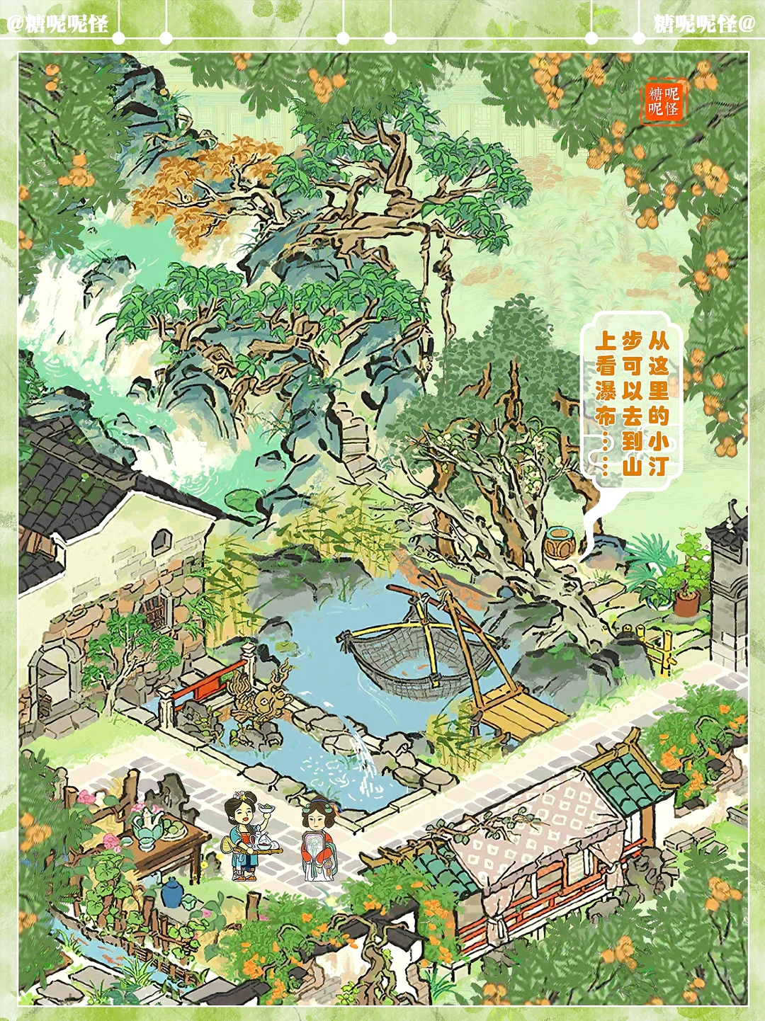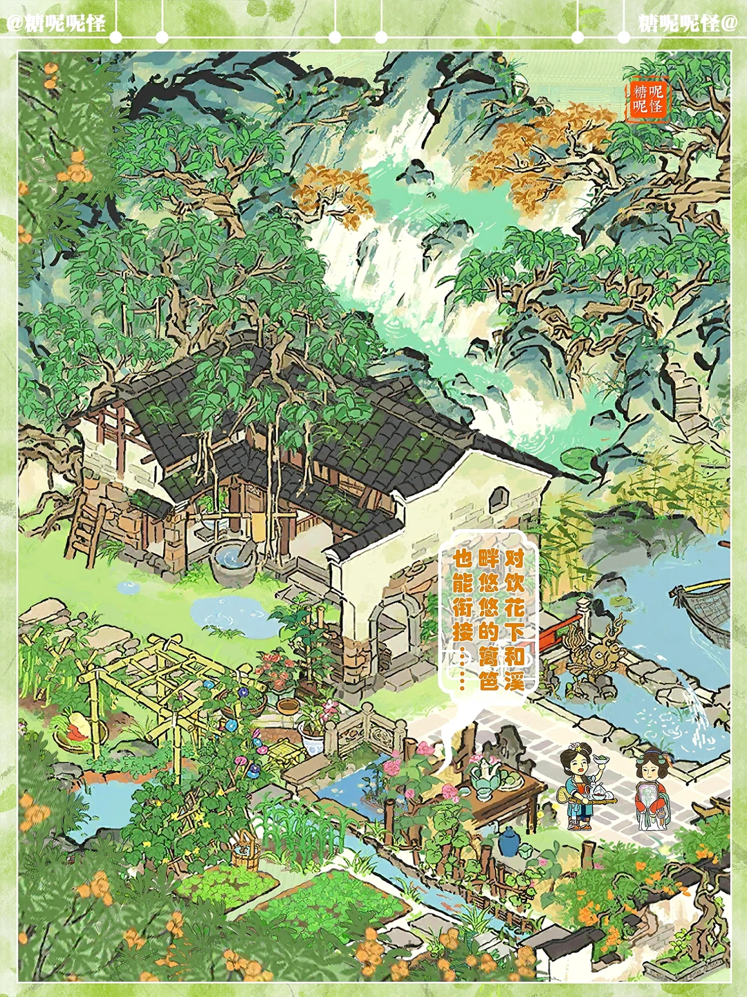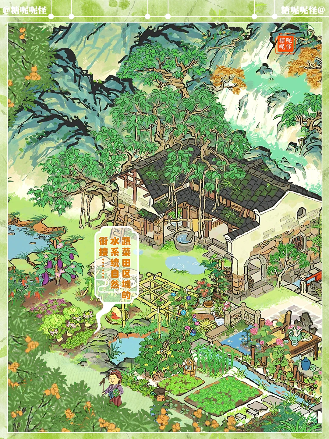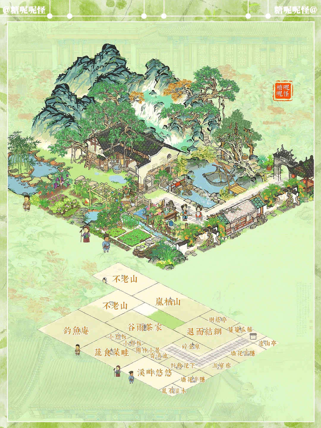 建筑:谷雨茶家|碎金泉|退而结网|蔬食菜畦|溪畔悠悠|钓鱼庵|不老山|岚栖山|树荫亭|墙花半隐|游宴廊