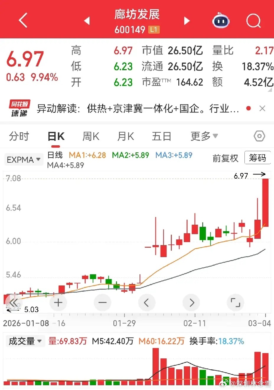 翻了下公告,暂无重大收购或转型消息,经营端也以供热等主业为主。今日主力净流入超6400万,换手率18.37%,资金博弈感拉满。