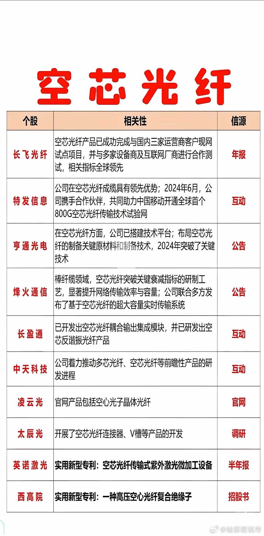 119、空心光纤A股梳理(2026-02)● 长飞光纤(601869)技术龙头,空芯光纤衰减系数全球领先(0.05dB/km),光棒自给率100%,中标移动、电信商用项目,进入微软/谷歌供应链。● 亨通光电(600487)量产规模与商用落地领先,空芯光纤产能大,海外订单充足,AI光纤供货北美云厂商。● 中天科技(600522)特种空芯光纤优势明显,海外拓展积极,算力基建核心供应商。● 烽火通信(600498)央企背景,集采份额高,光棒+设备一体化,国内算力网络建设受益。其他相关标的● 光迅科技(002281):光芯片+光模块,配套空芯光纤系统● 永鼎股份(600105):高端AI光纤+空芯光纤布局● 特发信息(000070):参与空芯光纤试验链路建设特发信息(1.2Tbs试验)、中天科技(反谐振专利)、烽火通信(低衰减方案)、亨通光电(全球首单商用)、长飞光纤(三运营商商用线),各有亮点。