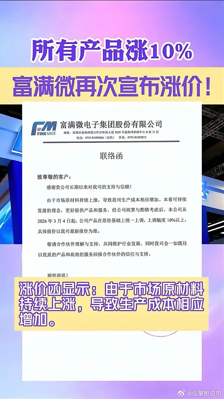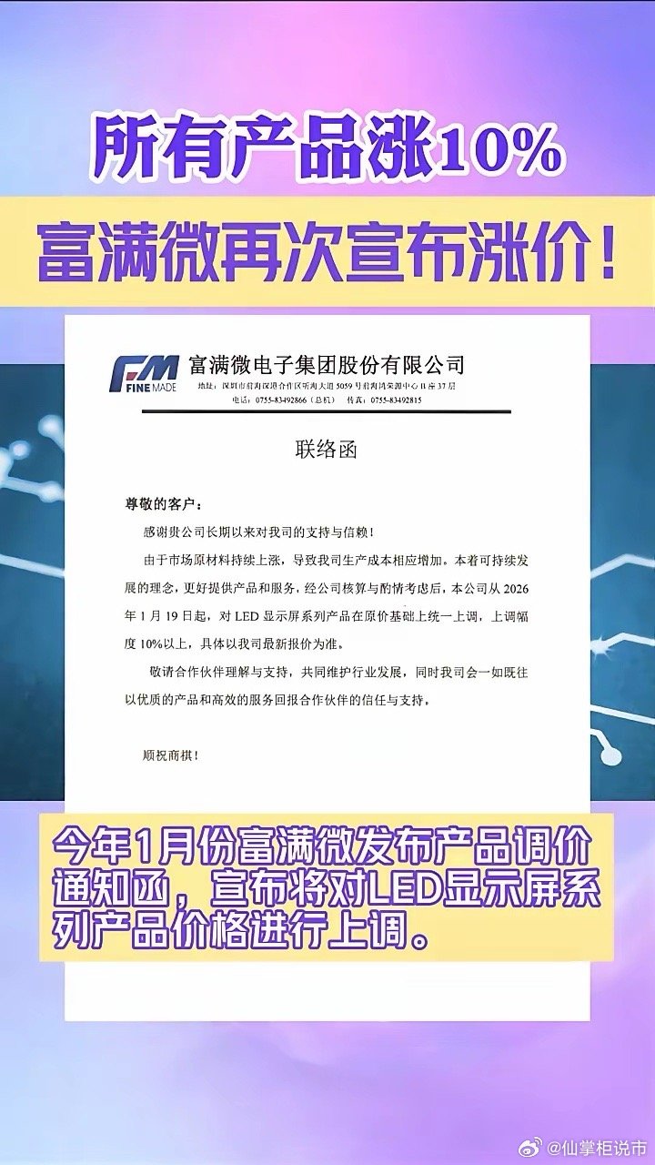 所有产品涨10%,富满微再次宣布涨价!今日,富满微电子宣布2026年3月4日起,公司产品在原价基础上统一上调,上调幅度10%以上,具体报价以我司最新报价为准。涨价函显示:由于市场原材料持续上涨,导致生产成本相应增加。今年1月份富满微发布产品调价通知函,宣布将对LED显示屏系列产品价格进行上调。芯片市场行情早知道,芯片超人。