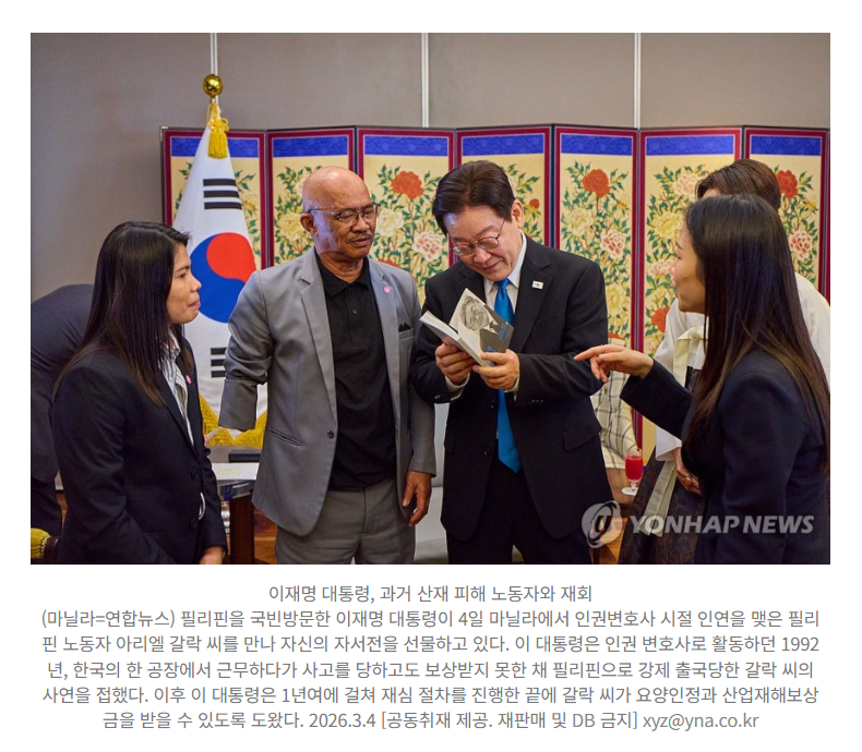 正在对菲律宾进行国事访问的李在明总统,于4日(当地时间)与34年前他担任人权律师时曾帮助过的菲律宾劳工出身的阿里埃尔·加拉克先生进行了"惊喜会面"。
