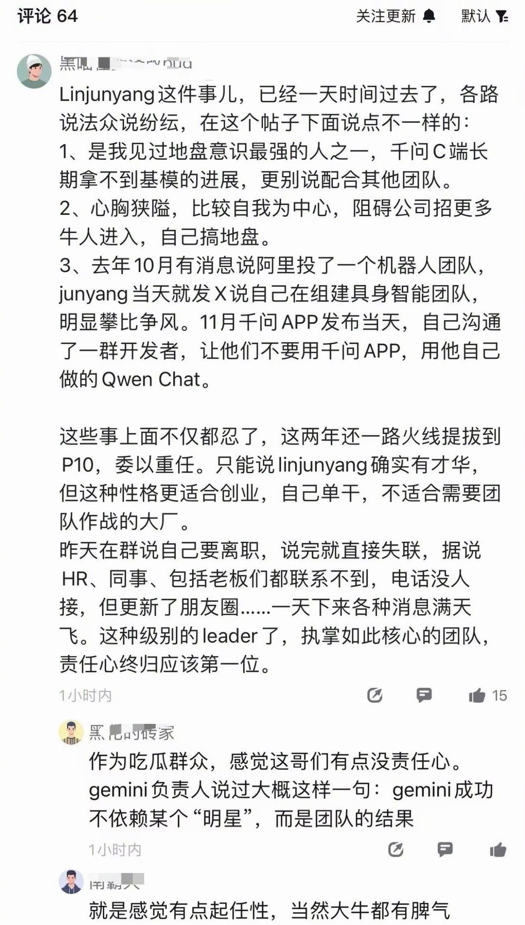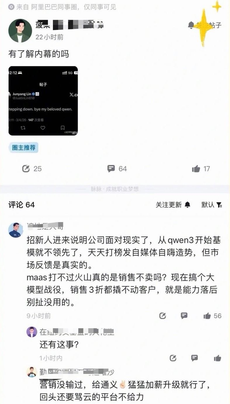 林俊旸离职有反转作为吃瓜群众,我算是看明白了。林俊旸能力再强,也挡不住心胸狭隘、搞小动作的本性:攀比争风、私下拉人不配合、用自己的成果挡别人的路,做事全凭自己想法。这性格在大团队里就是毒瘤,离开阿里,对阿里来说反而是“福报”!