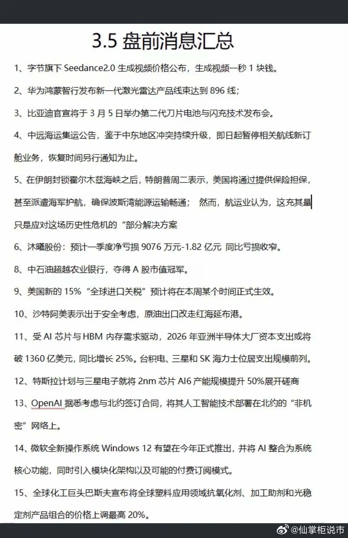 1.字节Seedance 2.0文生视频2.华为鸿蒙,激光雷达3.比亚迪,刀片电池4.内存,半导体5.巴斯夫,防老剂涨价