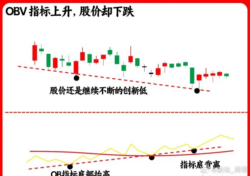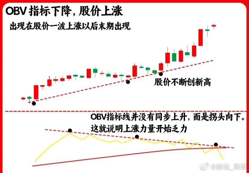 股价继续创新高,而obv指标开始下行,就形成差异走势,这就是顶背离。说明上涨动力开始变弱,多方力量跟不上,主力开始出货了