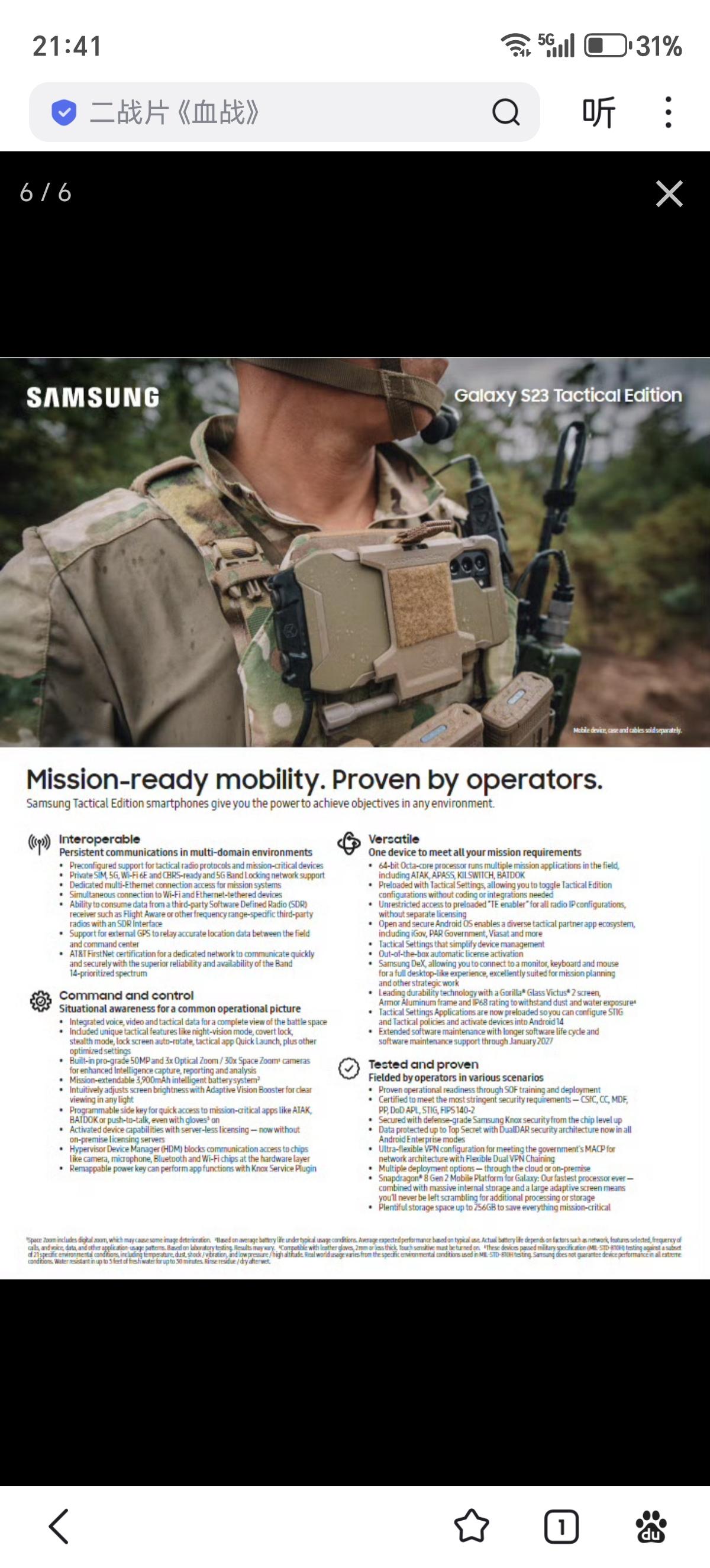 日本自卫队空降部队配备三星手机,可能是安装了“战术攻击套件”(TAK)软件的三星GALAXY S23战术版(TE)手机,手机壳是Juggernaut.Case 公司的Galaxy S23 Ultra ADVNTR,一个手机壳售价95美元,TAK可以在电子地图上显示所有士兵所处位置和敌人的行动路线,并可启动短信等功能。有助提升作战态势感知、信息传输或简化指挥链,给予指挥层级如同「上帝视角」的态势图,迅速掌握部队规模、地点及动向,可设定的最小单位为排级 S23战术版的机身设计和规格,跟普通版完全一样,但加入了额外的软件功能和保安选项,例如在戴着夜视镜时,战术板可以允许打开或关闭手机屏幕,而不会被屏幕光致盲。而且用户可以禁用LTE并使所有RF广播静音,从而消除几乎任何被窃听的机会,听起来像是某种高级版的飞行模式。 除此之外,用户还可以在横向的情况下解锁使用战术版手机,这样就可以在将设备安装到胸部的同时快速启动应用程序。战术版完全是为政府和军方量身定制,使用的是获得了美国国家安全局的批准的安全增强型安卓操作系统,解决了困扰民用手机与平板电脑的安全问题(敌人窃听、劫持信号等等),拥有两层足够强大安全系统,可以处理最高机密数据,并且不用任何额外设置,直接就能连接到战术无线电和任务系统。 不过战术版手机的大多数通信功能被禁用,包括蜂窝天线、Wi-Fi和蓝牙功能。取而代之的是,设备通信通过USB连接士兵臀部安装的「步兵电台」,并由电台将系统接入军用网络。 三星 Knox 提供硬件级加密,而双静态数据加密 (DualDAR) 则进一步增强了安全性。无服务器许可证激活功能支持灵活的部署方式。手机均预装了用于态势感知的TAK和用于实时获取患者信息的战场辅助创伤分布式观察套件 (BATDOK)