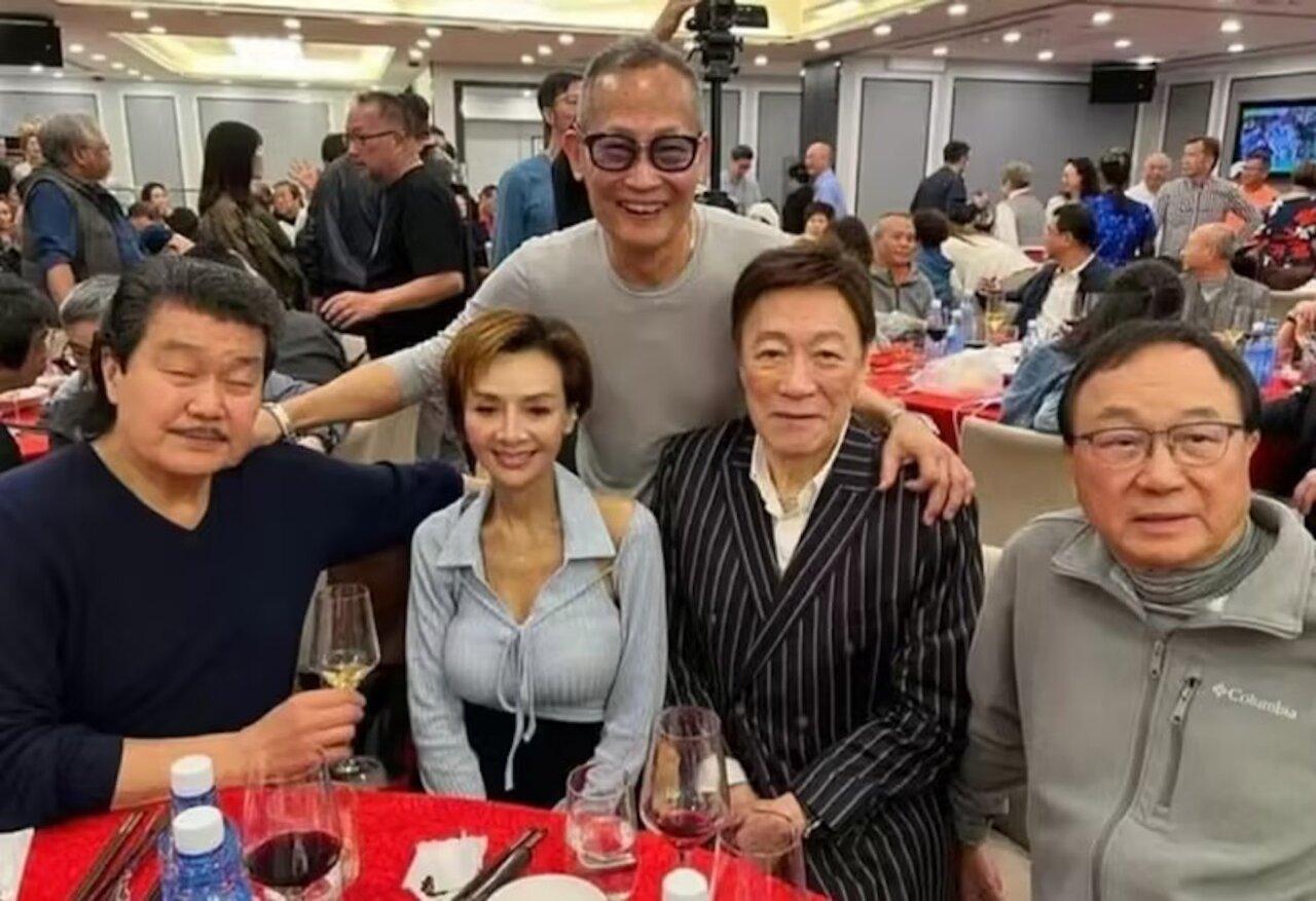 这张合照,我一眼就认出了赵雅芝的老公黄锦燊,虽然手执酒杯闭着眼,但辨识度太高;当然还有喜容绽放、峰峦起伏的叶子楣!那位穿着条纹西装的是陈欣健吗?顺便问问那两位眼镜男是谁?