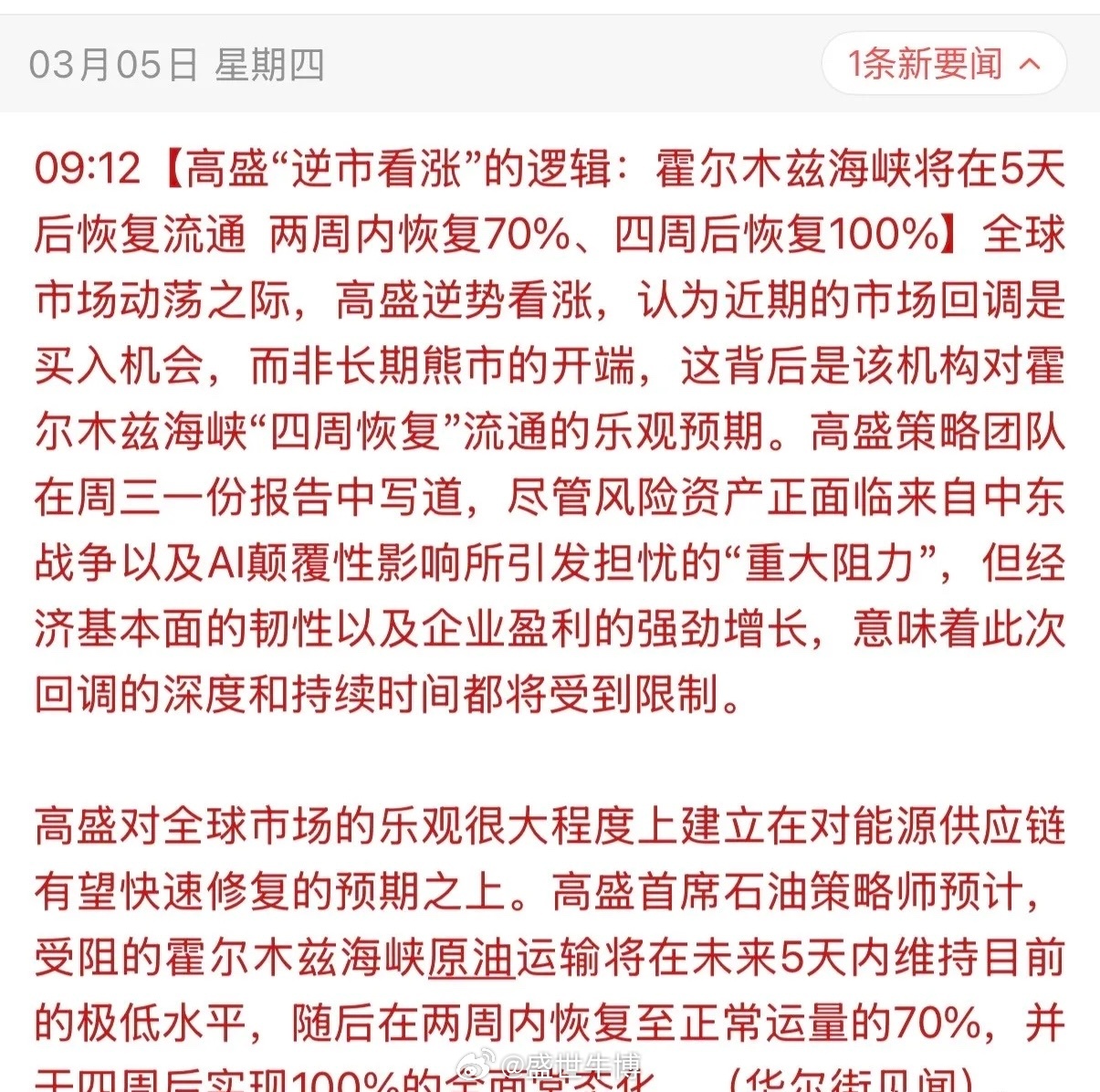 高盛的“和平剧本”:谁在为中东火药桶倒计时?高盛一纸“四周停战”预测,竟与白宫口径完美共振,仿佛已为霍尔木兹海峡的炮火写好了休止符。这究竟是未卜先知,还是资本与权力的共谋?美以的导弹、伊朗的抵抗、三国的经济绞杀,哪一环不是悬而未决的生死棋局?当华尔街用“100%恢复流通”的童话粉饰战火,别忘了,子弹不听财报指挥,人民的意志更非算法能预测。这种建立在流沙上的乐观,不过是资本家的盛宴邀请函。面对不确定性,我们唯有清醒—在炮火未歇之前,任何“精准预测”都是对现实的轻慢。保持警惕,远比盲从“专家”更接近真相!