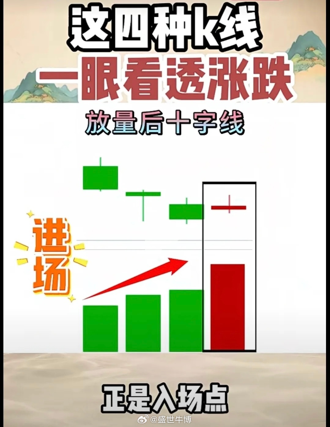 放量后十字星,正是进场点 这句是短线抓启动的经典口诀,专门抓洗盘结束、变盘向上的位置。 一、什么意思? 前面有一根放量阳线/放量止跌K线(资金进场)- 接着收一根十字星(小阴小阳、上下影、振幅小)- 代表:洗盘完毕、抛压没了、变盘在即 核心:放量定方向 → 十字星洗盘 → 马上拉升 二、必须满足 1. 位置:低位、回调末端、上涨中途,不是高位2. 前面放量:放量阳线/放量止跌,资金明显进场3. 十字星缩量:十字星这天缩量、不创新低三、为什么是进场点? 放量:主力动手- 十字星:短暂停顿、洗浮筹- 缩量:没人卖了,一拉就涨 四、进场 & 止损 进场:十字星次日 高开/收阳 即可介入- 止损:跌破十字星最低价,认错出局五、最简口诀放量之后十字星,洗盘完毕要拉升;次日阳线一确认,大胆进场不等