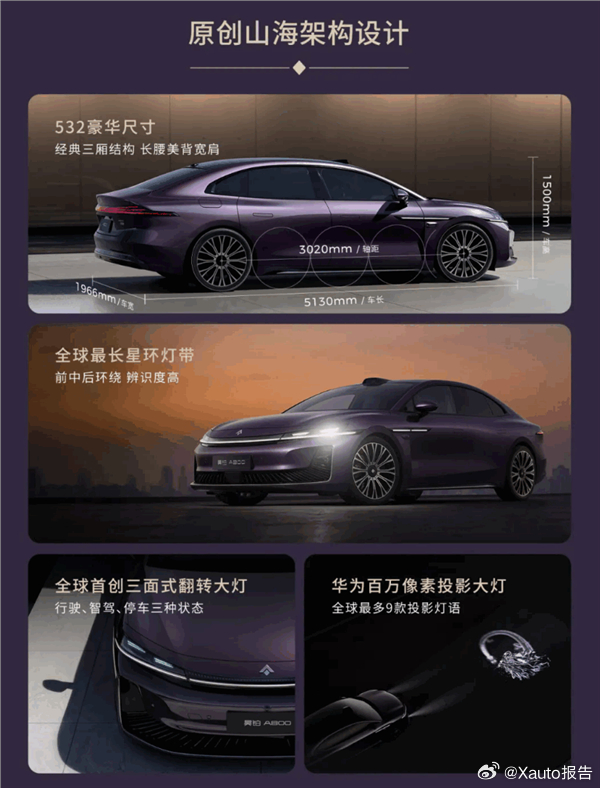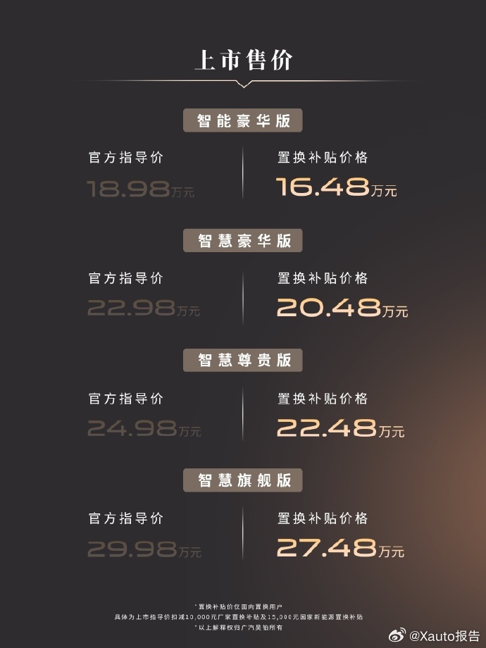3月4日,广汽昊铂全新旗舰车型昊铂A800上市,共推出四款车型,官方指导价18.98-29.98万元,全系可享2.5万元的置换补贴,补贴后价格区间为16.48-27.48万元。该车由广汽与华为合作,搭载华为乾崑ADS 4.1、鸿蒙座舱5,配备尊界S800同款896线四激光雷达。
