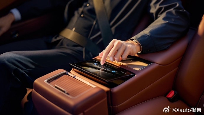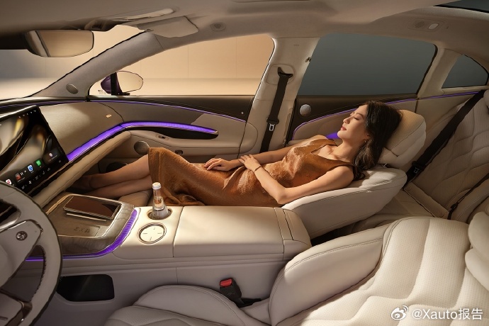 内饰采用环抱式布局,配备10.25英寸仪表、14.6英寸中控屏、27英寸W-HUD、23扬声器音响、NAPPA真皮座椅,后排首创2+1变形座椅。安全标配14个安全气囊,含国内首创二排正面气囊。