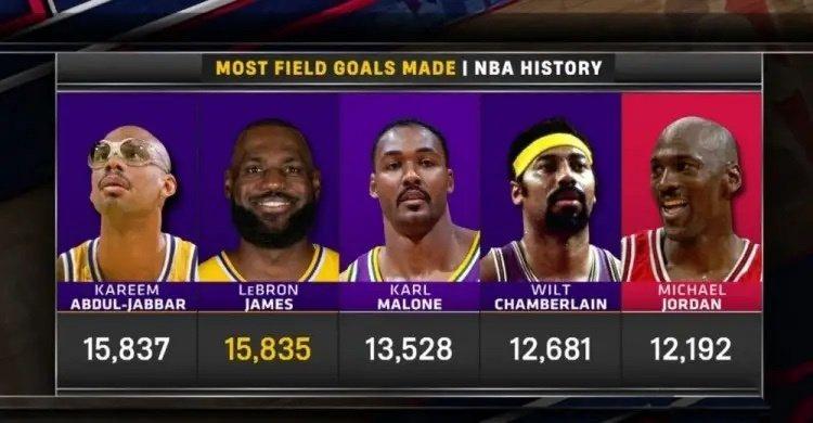 詹姆斯还剩下最后一项历史记录,运动球命中个数。 他15835个进球,马上要超越贾巴尔。 现在老詹4.3万分独霸总得分榜,罚球,还有三分投的比贾巴尔多多了。 最终投入1.7万球就不错啦。[赞]