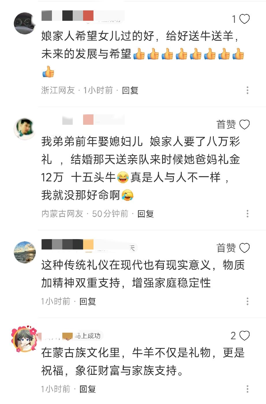 这两天,内蒙古有个出嫁的姑娘,算是把全网都给整破防了。不是什么豪门婚礼,是她那40多个娘家人,组团去看她,结果后头跟着的大卡车一开门,蹦下来10头牛、40多只羊。 那个画面感真的太强了。婆家人估计站在门口都看傻了——这哪是走亲戚,这是给闺女送了一个移动牧场啊。 网上都在说,这娘家太霸气了,给女儿撑腰呢。但我说句实在话,大家可能都看漏了一点。那40多口人,其实就是这10头牛和40只羊的“说明书”。他们折腾一个半小时跑过来,坐下来跟婆家吃顿饭、聊聊天,比那车牛羊更让婆家掂量分量。 婆家看到这个阵仗,心里门儿清:这姑娘背后,是一个活生生、热腾腾的大家族。这么看重这个闺女,咱们可得对人家好点。这种无形的“社交货币”,才是姑娘以后漫长日子里最值钱的东西。 还有网友人间清醒,说根据《民法典》,如果赠与时没明确只给女方,那这就是夫妻共同财产。你看,娘家人大老远送来,图的根本不是“这是我的”,人家图的是“你们俩好好过日子”。这份心胸,比牛羊更珍贵。 有人开玩笑说女婿头大了,这么多牛羊养不起咋整。但对于这个草原上的小家庭,看着满院子活蹦乱跳的牛羊,闻着屋里飘出的肉香,听着亲戚们的笑声——这种烦恼,大概也是一种幸福的烦恼吧。 说到底,咱们羡慕的,是那个姑娘推开门,发现身后站着一整支部队时的底气。是无论走多远,都有一帮人愿意为你折腾、为你奔赴的牵挂。在这个什么都讲究边界感的时代,这种滚烫的、不讲道理的亲情,太稀罕了。
