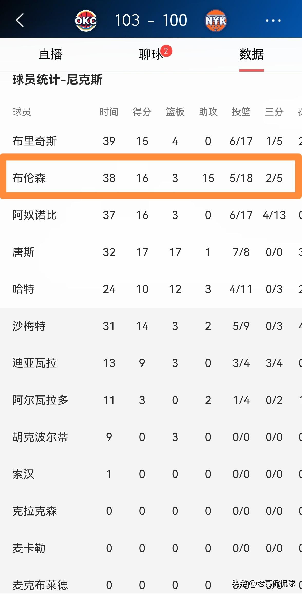 尼克斯巨星布伦森的进攻效率真是惨不忍睹!在今天尼克斯主场以100:103惜败于雷霆的比赛中,布伦森在投篮端的表现极其的糟糕,布伦森堪称尼克斯输球的罪魁祸首。 全场比赛下来,布伦森首发出战38分钟,投篮18中5,其中三分球5中2、罚球6中4极其低效的得到16分,不过有15次助攻,还有3次失误。 作为尼克斯的当家球星和绝对核心,即便本场比赛布伦森送出了15次助攻,那么布伦森依然要为球队的失利负主要责任。