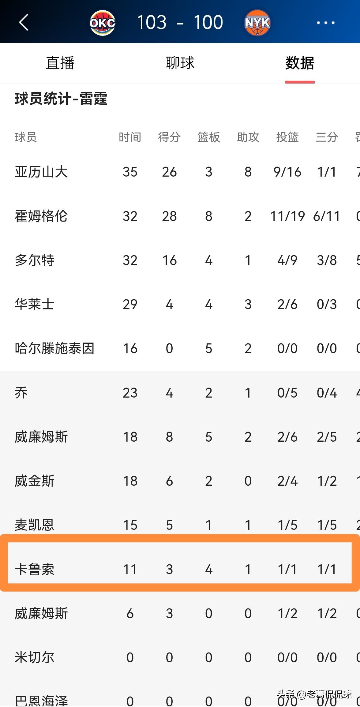 雷霆老将卡鲁索真是太可惜了!在今天雷霆客场以103:100战胜尼克斯的比赛中,卡鲁索因为左髋挫伤而提前退赛,他在替补出战的11分钟里,三分球1中1得到3分,还有4篮板1助攻2抢断,他的场上正负值为-4。 毫不夸张的说,如果卡鲁索没有因伤提前退赛,那么雷霆绝对不会和尼克斯战斗到最后一刻才分出胜负,毕竟卡鲁索对于雷霆的重要性是不言而喻的。