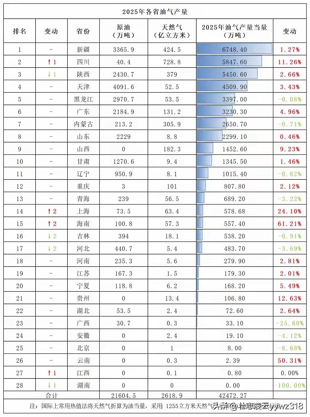 惊掉下巴!2025全国油气大洗牌,四川直接逆袭,排名彻底变了! 你敢信吗? 咱们国家的油气版图, 2025年迎来了颠覆性大变化! 真的太让人惊喜了! 2025年我国油气产量当量达到4.2亿吨, 直接创下历史新高, 原油产量2.16亿吨,天然气2619亿立方米, 历时多年的油气增储上产七年行动计划, 圆满收官! 最让人振奋的消息来了: 四川实现历史性大突破! 以5847.6万吨油气当量, 成功超越陕西, 一跃升至全国第二位! 其中天然气产量728.8亿立方米, 稳稳拿下全国第一! 四川盆地天然气总资源量高达40万亿立方米, 占到全国总量的三分之一, 实力真的太硬核了! 西南油气田年产量突破500亿方, 万米深井顺利完成钻探, 正式领跑全国深地勘探, 看得人心里满满都是踏实感! 而新疆依旧实力在线, 连续多年稳居全国第一, 油气当量6748.4万吨, 原油、天然气产量均排在全国第二, 三大盆地、深地一号、页岩油示范区全面发力, 稳稳扛起能源大梁! 更值得骄傲的是, 我国海洋油气产量当量突破9000万吨, 渤海油田产量超4000万吨, 非常规天然气占比达到42%, 能源战略接替全面到位! 从深海到万米地下, 咱们国家的能源自主保障能力越来越强, 能源安全牢牢握在自己手里, 真的太安心了! 你觉得四川未来能追上新疆吗? 你家乡用上四川的天然气了吗?
