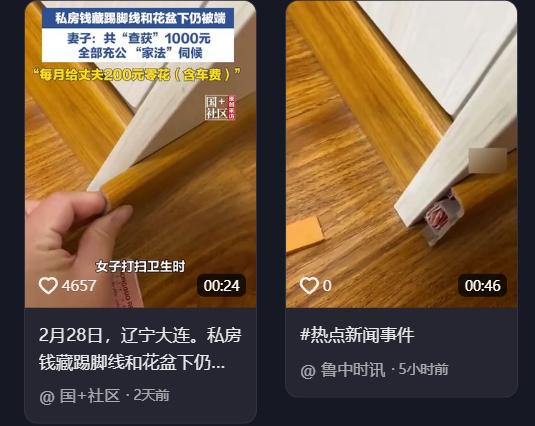 笑不活了!辽宁一女子在家搞大扫除,拖地时,拖把头不小心磕到了墙角的踢脚线卡扣,原本想顺手安回去,结果定睛一看,好家伙!这踢脚线后面居然是空的,里面赫然塞着一卷红彤彤的钞票! 辽宁二月的风还带着刀子,沈阳这位大姐万万没想到,自己就是想在3月前收拾收拾家,结果一拖把下去,愣是把自己家砸成了"考古现场"。2月28日那天,大姐正抡着拖把在客厅里横扫千军,拖把头那块沉甸甸的金属扣"哐当"一声,结结实实磕在了墙角踢脚线上。扣板松了,她本想蹲下随手按回去,可缝隙里漏出的那抹红,让这位干活麻利的东北媳妇当场愣住了。 那种红,不是装修底漆的红,是百元钞票特有的、能让所有家庭主妇瞬间血压飙升的红!她像拆盲盒一样把扣板掰开,里头竟然藏着个半空的洞,一卷钞票正整整齐齐地躺在那儿"面壁思过"。 那一刻,大姐没感受到中奖的狂喜,第一反应反而是:这家里,难道还有我不知道的"信号盲区"?探进缝隙的手指传来了真实的纸质触感,顺着这根"红线",她发挥了侦查天性,没过一会儿,又在窗台的花盆底摸出了几张"漏网之鱼"。两处阵地合围,不多不少,正好1000块整。 按理说,这本该是家庭风暴的导火索。毕竟在移动支付把现金逼成"稀有物种"的2026年,谁特意换出一叠红票子藏在墙缝里,摆明了是蓄谋已久的"暗账"! 可就在大姐火气刚要上头,伸手去掏踢脚线最深处的灰尘时,一张折叠得像情书一样的纸条跳了出来。字迹工整得甚至有些卑微:"亲爱的老婆,我就知道你能找到我给你的惊喜,祝你今天开心。"文末还缀着一个画风跑偏的歪歪扭扭的笑脸。 这哪是私房钱?这分明是丈夫给自己买的一份"求生保险"!他精准地预判了妻子的侦查路径,也预判了妻子发现后的雷霆之怒,于是在雷管旁边提前放了一盆熄火的水。这仗还没打,大姐就先被这极强的"求生欲"给气乐了,原本准备好的连珠炮火,被这张纸条化成了一口无奈的长叹。 可你要是翻开这家人的账本,你就会发现这1000块钱背后,藏着一个成年男性极其壮烈的生存史。丈夫每月的零花钱是雷打不动的200元。按照大姐后来的还原,这钱得劈成八瓣儿花。每天上班坐公交,往返4元,一个月22个工作日就是88元,即便按照最省钱的公交换乘,44元的通勤开支也是死账。剩下的156元,得应付偶尔的烟瘾、同事的聚餐,或者是路边的一瓶矿泉水。 这1000块钱,得是多长一段时间里,从牙缝里、从午饭里、从拒绝掉的每一次社交里,一分一毛抠出来的!这不是单纯的数字,这是一个男人在生活细碎的磨损中,为自己搭建的最后一点物理意义上的自由堡垒。 大姐把这段经历拍成了视频,没带半点怨气,反而像在讲一个好玩的段子。没想到,这踢脚线下的"藏宝图"直接在网络上炸了锅,甚至被封为"2026年度最有创意藏钱位"! 网友们瞬间在评论区搞起了"经验互助会",旧鞋盒、米缸底、花盆夹层,各种藏钱老路子在踢脚线这种"空间政治学"面前,显得笨拙且毫无技术含量。 这种集体狂欢的背后,其实是人们对婚姻里那些"无伤大雅的小秘密"的一种温柔致敬。在东北这种直来直去的相处逻辑里,大声嚷嚷出的不满往往转瞬即逝,而这种"我懂你的小心思,你也懂我的不容易"的默契,才是日子能过下去的胶水。 这1000块钱最后有没有归还给丈夫,我们不得而知,但那个笑脸纸条肯定会被记很久。婚姻这种事,有时候确实不需要绝对的透明,留一点像踢脚线卡扣那样的缝隙,反而让两个人的空间不至于因为过热而变形。 这场家庭版"猫鼠游戏"没有输家,丈夫保住了他的幽默,妻子收获了意外的开心,而生活在这一磕一碰之间,也有了真实的温度。