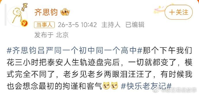 齐思钧回应和吕严同一个初高中快乐老友记 最熟悉的陌生人实锤!齐思钧和吕严从幼儿园到初高中都同校,兜兜转转还是彼此,缘分太绝了!快乐老友有风季