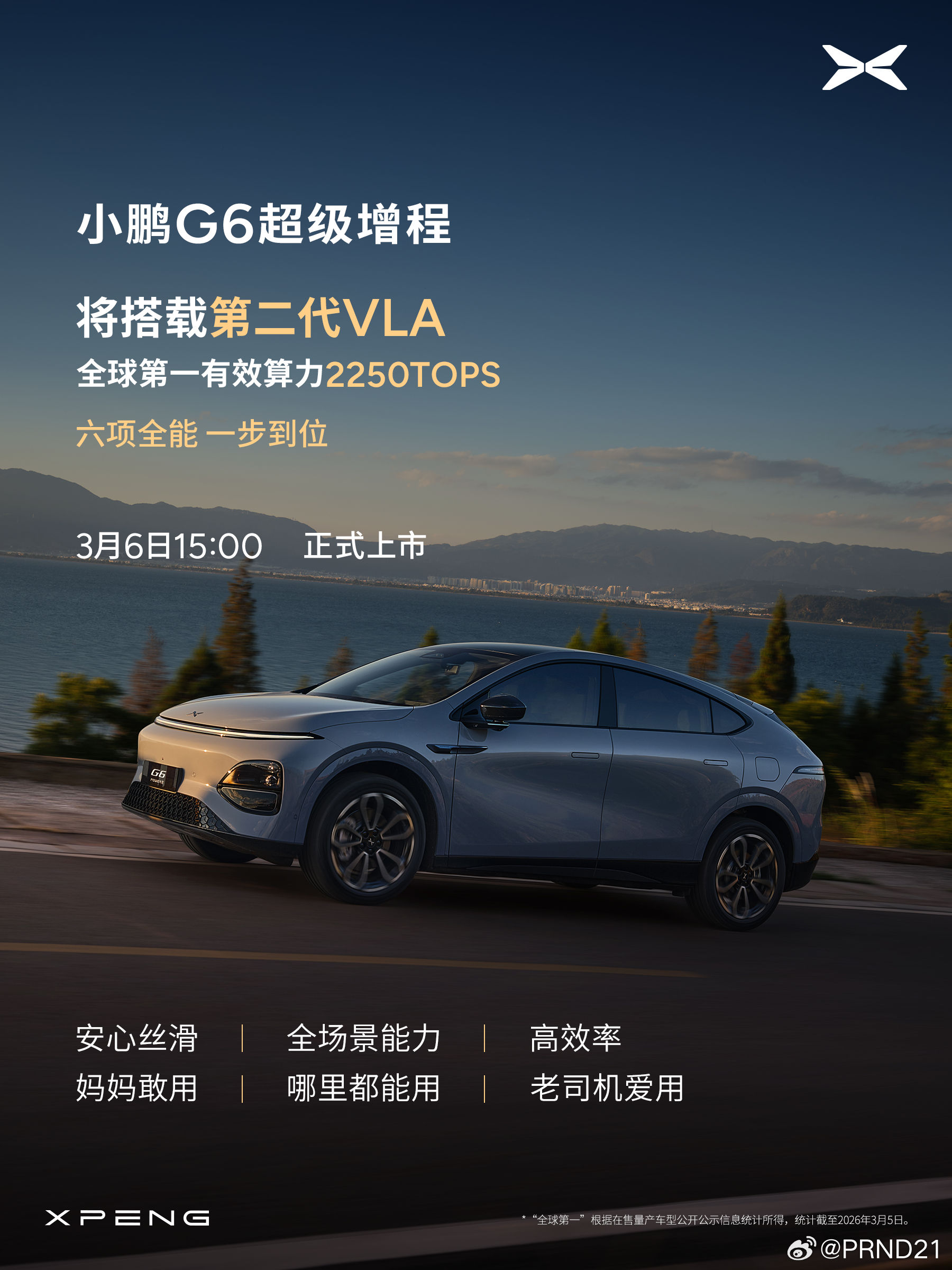 之前在公告里亮相的G6增程版明儿就要正式发布了,看来也是1.5T引擎+大电池大油箱的组合,感觉定价门槛甚至会比G7增程更低啊……小鹏G6超级增程上市定档3月6日小鹏G6超级增程六项全能一步到位
