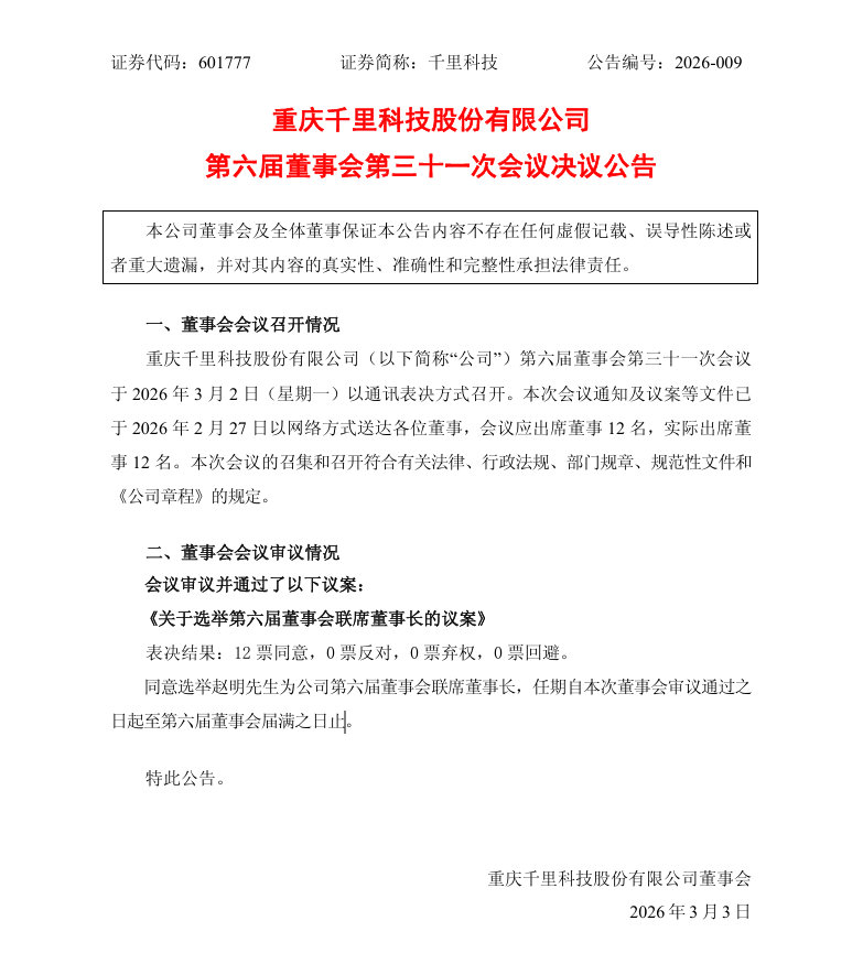 公告显示,赵明(前荣耀终端股份有限公司 CEO)以 12 票同意、0 票反对 / 弃权 / 回避,将出任千里科技第六届董事会联席董事长,任期自本次董事会审议通过之日起至第六届董事会届满之日止。