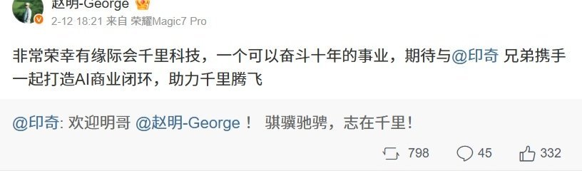 今年 2 月 12 日,赵明在微博发文宣布:非常荣幸有缘际会千里科技,一个可以奋斗十年的事业,期待与 印奇兄弟携手一起打造 AI 商业闭环,助力千里腾飞。千里科技董事长、阶跃星辰董事长印奇发文对赵明入职表示欢迎:“骐骥驰骋,志在千里!”