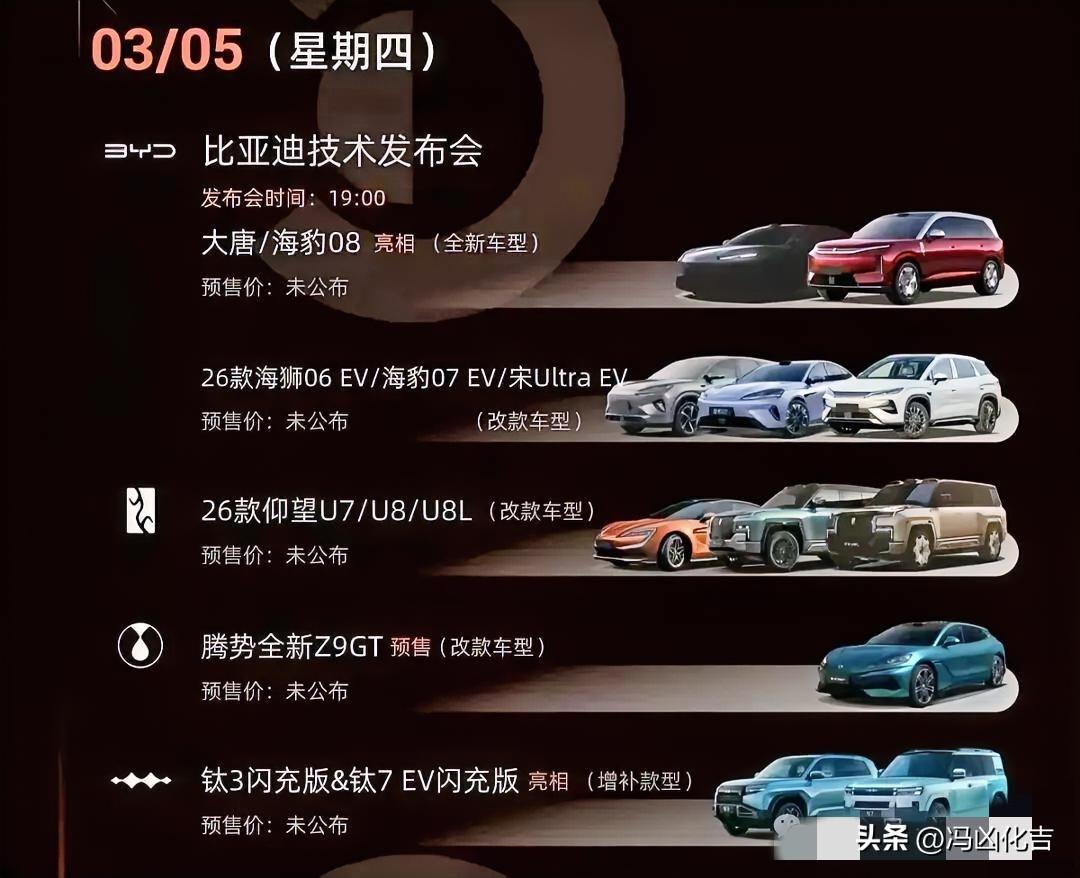 3.5日七点,比亚迪举行二代兆瓦闪充以及新车型发布会。大唐,海豹,方程豹钛系列,腾势,仰望等。歌手王力宏出席发布会,并演唱歌曲,改变世界。总之而言,我希望比亚迪越来越好,中国新能源汽车越来越好,走向世界。