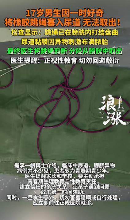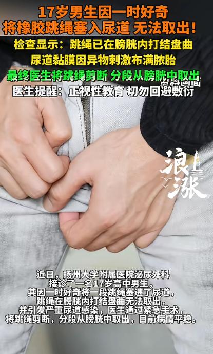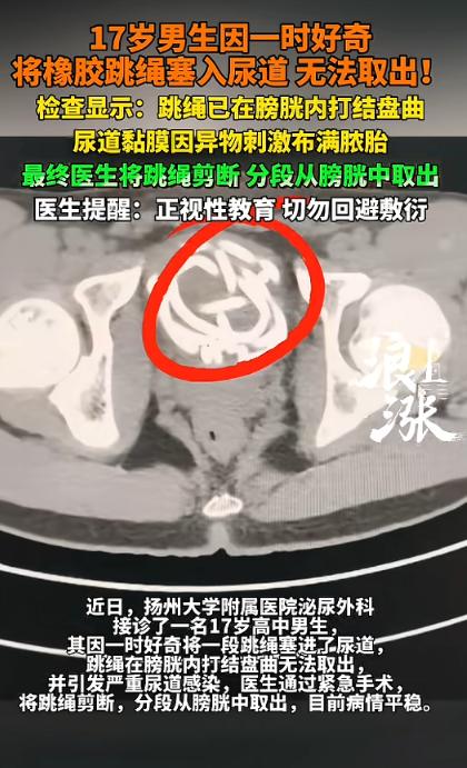 “正视性教育切勿回避敷衍!”近日,江苏扬州,一17岁高中男生因为好奇,竟将橡胶跳绳插入尿道,绳索相互缠绕,形成了难以解开的死结,最后没办法取出,疼的男生哇哇直叫,排尿困难,因为滞留时间较长,尿道出现了严重感染并形成脓胎!网友:丢人丢大了! 事情发生在3月初。 那天傍晚,扬州大学附属医院泌尿外科的诊室里走进一对母子。 男生弯着腰,双手按着小腹,脸色发白,走路发颤,每挪一步都像踩在针上。 医生原本以为是常见的泌尿系统结石,可询问病情时,男生反复沉默,只说肚子胀痛,排不出尿。 直到家长追问,他才低声说出实情。 几天前独自在家,他对身体产生好奇,看见客厅里的橡胶跳绳,竟起了试探的念头。 绳子起初还能拉动,随后越滑越深,等他意识到不对,想要抽出时,已经被卡住。 他尝试自行拉扯,反而让绳索在体内缠绕成团。 疼痛越来越重,小腹鼓胀明显,却迟迟不敢求助。 憋了一天多,排尿困难加剧,他才向母亲坦白。 医院很快安排影像检查。 结果显示,跳绳已经进入膀胱,并在里面打成死结。 异物滞留时间较长,尿道黏膜受到刺激,表面布满脓胎,感染明显。 再拖延下去,可能引发更严重的并发症。 接诊的李一帆博士团队立即启动急诊手术。 考虑到患者年纪尚小,团队决定采用腹腔镜下膀胱切开异物取出术。 这种方式通过几个微小切口进入体内,创伤相对较小。 手术中,医生先清理尿道内的脓性分泌物,再探查膀胱。 内镜画面里,橡胶绳在膀胱内盘曲缠绕,结扣紧实,无法直接解开。 医生只能用细小器械一点点剪断,再分段取出。 整个过程持续一个多小时。 当最后一段绳子被取出,医护人员才放下心来。 取出的橡胶绳长度不短,表面已被脓液覆盖。 术后医院联合儿外科进行抗感染治疗。 几天后,男生的疼痛缓解,排尿逐步恢复,病情趋于平稳。 医生介绍,类似尿道和膀胱异物的病例并非孤例。 患者多集中在青春期阶段。 这一时期身体发育迅速,对生理变化充满探索欲。 缺乏系统知识,又不愿主动求助,往往会采取冒险方式尝试。 有的人拖延就医,自行处理,结果加重损伤。 这名男生的情况幸亏送医及时,没有造成长期功能受损。 医生提醒,身体存在明确的安全边界,任何异物进入泌尿系统都可能带来感染和损伤风险。 遇到类似意外,应当立即前往正规医院处理,不要隐瞒。 家长与学校在青春期阶段的沟通显得格外重要。 科学讲解生理知识,比回避更有意义。 让孩子明白身体结构和风险所在,远比事后补救更有效。 这起事件最终以平稳恢复收尾,却也给不少家庭提了个醒。 好奇本身无可厚非,前提是建立在安全和认知基础之上。 (信息来源:浪涨新闻《17岁男生因一时好奇,将橡胶跳绳塞入尿道无法取出!检查显示:跳绳已在膀胱内打结盘曲,尿道黏膜因异物刺激布满脓胎。最终医生将跳绳剪断分段从膀胱中取出医生提醒:正视性教育切勿回避敷衍。》)